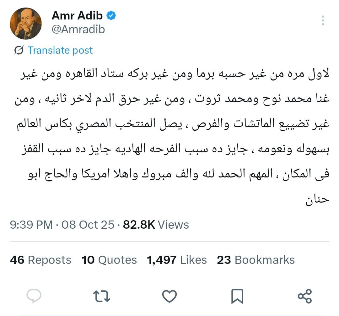وكتب عمرو أديب عبر حسابه الشخصي على إكس:"لأول مرة من غير حسبة برما ومن غير بركة ستاد القاهرة ومن غير غنا محمد نوح ومحمد ثروت، ومن غير حرق الدم لآخر ثانية، ومن غير تضييع الماتشات والفرص، يصل المنتخب المصري بكأس العالم بسهولة ونعومة جايز ده سبب الفرحة الهادية جايز ده سبب القفز فى المكان، المهم الحمد لله وألف مبروك وأهلا أمريكا والحاج أبو حنان".