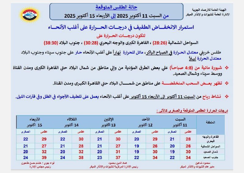 وفيما يخص توقعات درجات الحرارة غدًا السبت 11 أكتوبر 2025:
