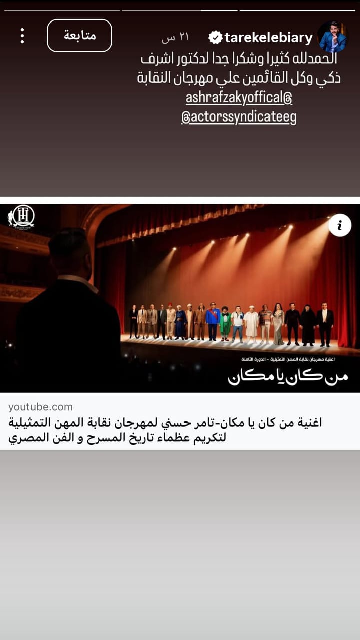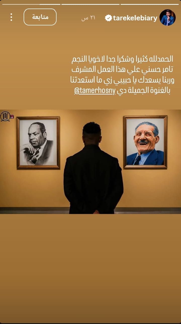 ورد عليه تامر حسني قائلاً: "يا طارق يا حبيبي، دي أقل حاجة نقدر نقدمها لعظماء مسرحنا المصري العظيم، وسلامي لكل العيلة، وياريت كانت الأغنية ساعتين علشان نحط فيها عظماء أكتر".