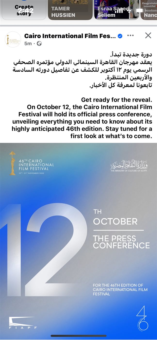 يعقد مهرجان القاهرة السينمائي الدولي، مؤتمره الصحفي الرسمي يوم 12 أكتوبر للكشف عن تفاصيل دورته السادسة والأربعين المنتظرة.