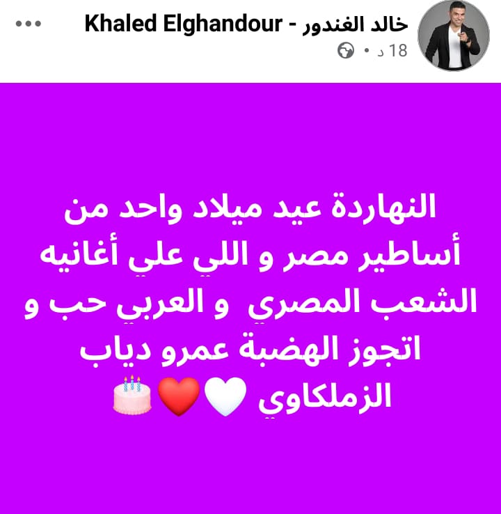 وكتب خالد الغندور عبر صفحته الشخصية "فيسبوك"، قائلا: النهاردة عيد ميلاد واحد من أساطير مصر و اللي علي أغانيه الشعب المصري و العربي حب و اتجوز الهضبة عمرو دياب الزملكاوي".