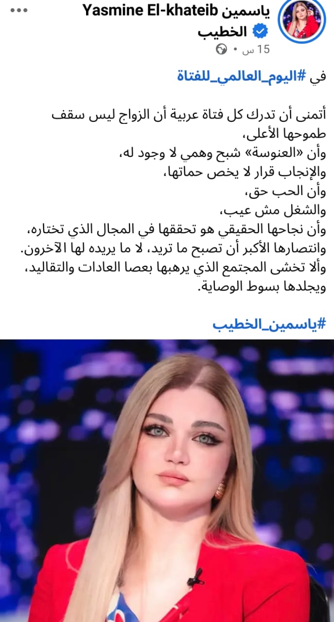 وكتبت الإعلامية ياسمين الخطيب عبر حسابها الشخصي "فيسبوك":في اليوم العالمي للفتاة أتمنى أن تدرك كل فتاة عربية أن الزواج ليس سقف طموحها الأعلى، وأن «العنوسة» شبح وهمي لا وجود له".