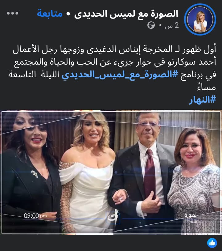 وكشفت الإعلامية لميس الحديدي عبر صفحتها الشخصية "فيسبوك"، قائلة: أول ظهور للمخرجة إيناس الدغيدي وزوجها رجل الأعمال أحمد سوكارنو في حوار جريئ عن الحب والحياة والمجتمع في برنامج الصورة مع لميس الحديدي الليلة التاسعة مساءً".