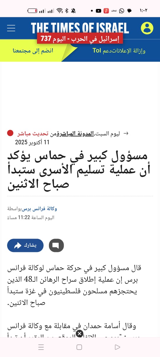 البث العبرية : مسئول كبير فى حماس يتوقع بأنطلاق عملية تبادل الأسرى وبدء الإفراج عن المحتجزين الإسرائيليين صباح الإثنين