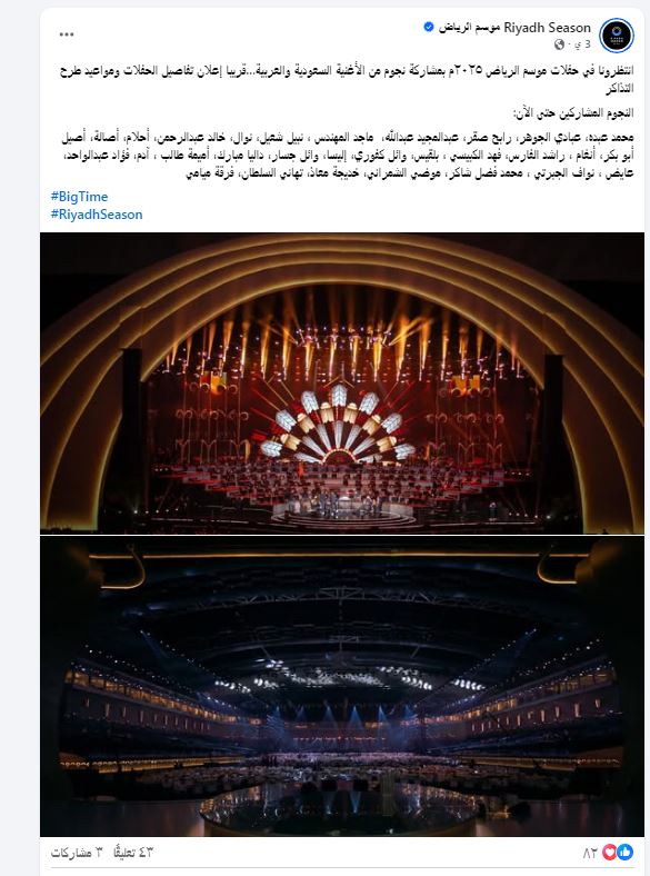 وكتبت الصفحة الرسمية لموسم الرياض 2025 عبر حسابها الرسمي " انتظرونا في حفلات موسم الرياض ٢٠٢٥م بمشاركة نجوم من الأغنية السعودية والعربية…قريبا إعلان تفاصيل الحفلات ومواعيد طرح التذاكر