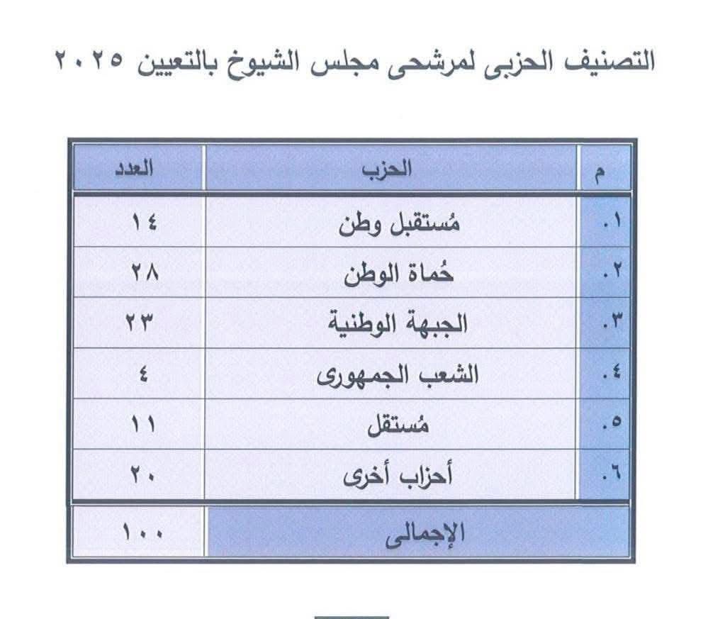 100 نائب بالتعيين في مجلس الشيوخ 2025.. «حماة الوطن» يتصدر و«مستقبل وطن» في المرتبة الثانية