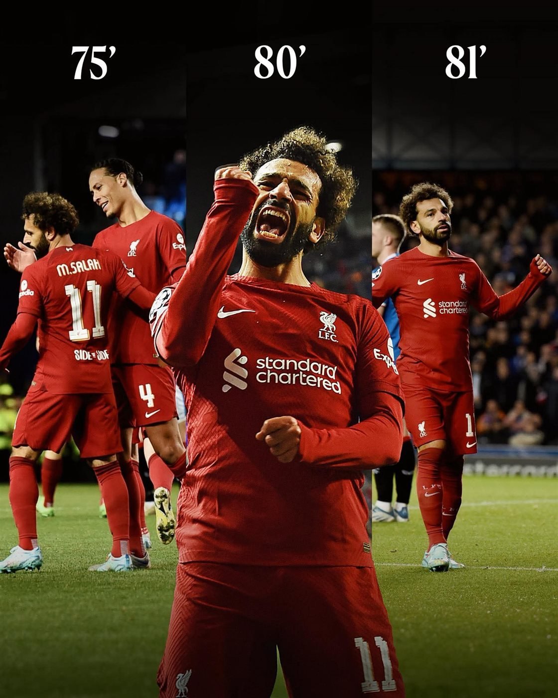 وجاءت ثلاثية صلاح المميزة في الدقائق 75 و80 و81 من مواجهة ليفربول أمام رينجرز الاسكتلندي، ليحقق رقمًا قياسيًا نادر الحدوث في البطولة القارية.