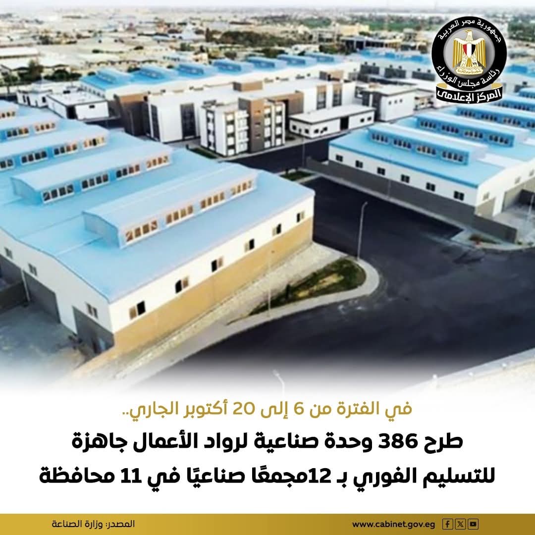 وزارة الصناعة تعلن طرح 386 وحدة صناعية شاغرة جاهزة للتسليم بـ 11 محافظة