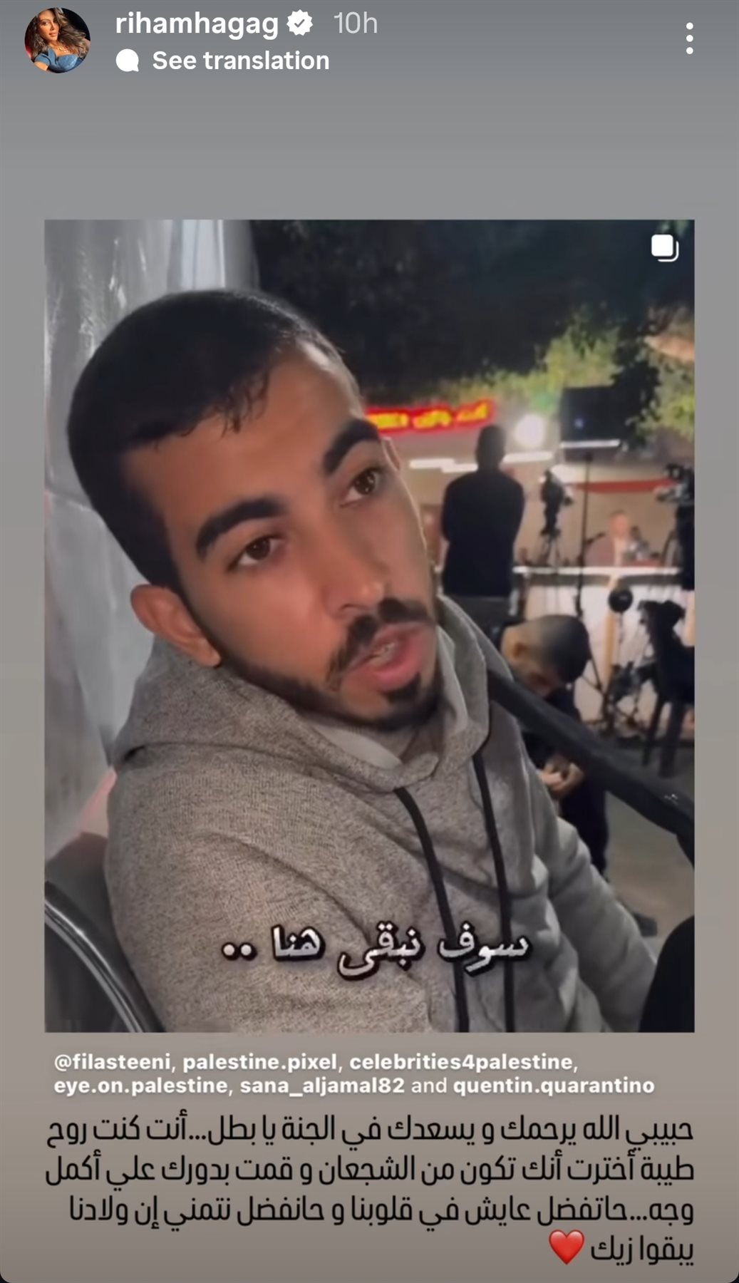 وكتبت ريهام حجاج، عبر خاصية "ستوري" على حسابها الرسمي بموقع “إنستجرام”، رسالة مؤثرة قالت فيها: "حبيبي الله يرحمك ويسعدك في الجنة يا بطل، كنت روح طيبة واخترت تكون من الشجعان وقمت بدورك على أكمل وجه، هتفضل عايش في قلوبنا وهنفضل نتمنى ولادنا يبقوا زيك".