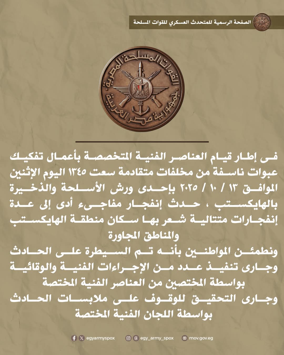 كشف المتحدث الرسمي باسم القوات المسلحة المصرية، اليوم، عن تفاصيل الأصوات الناتجة عن الانفجارات المتتالية التي شعر بها سكان مناطق الهايكستب وبدر والشروق.