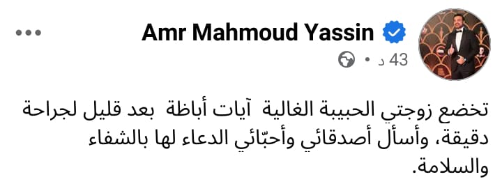 توسل السيناريست الكاتب عمرو محمود ياسين جمهورة ومتابعية بالدعاء لزوجتة الإعلامية اَيات أباظة قبل خضوعها لعملية جراحية دقيقة.