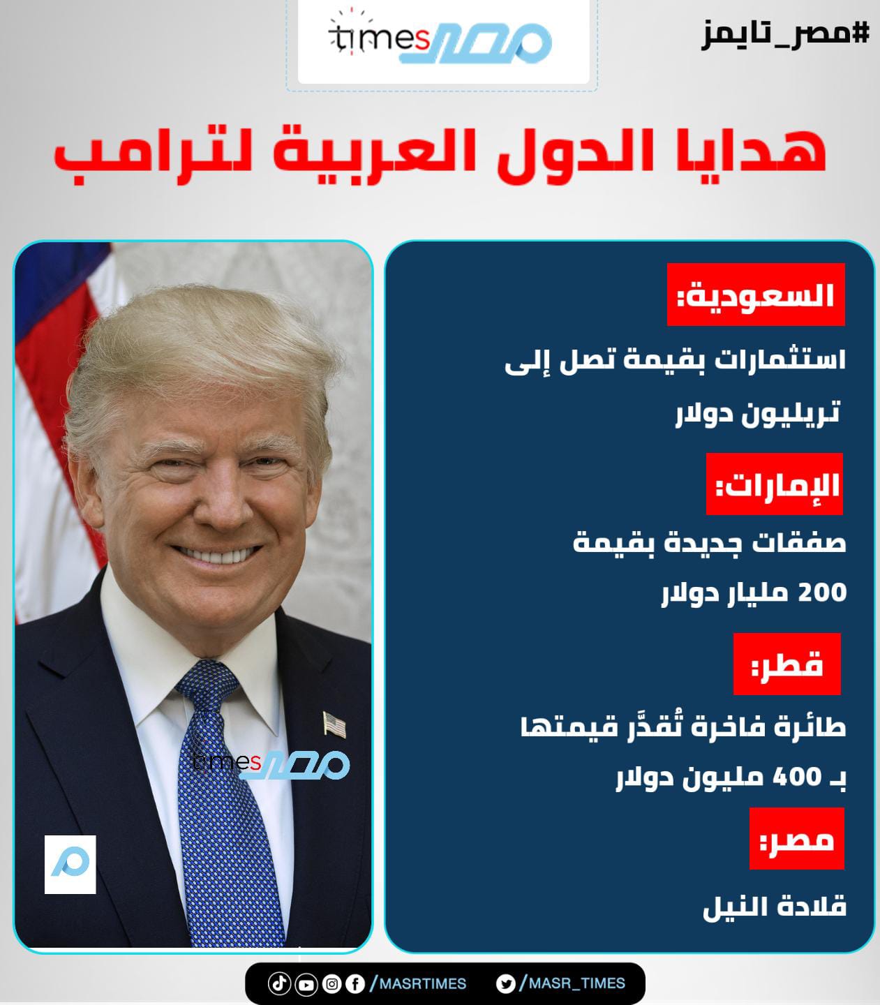 أما مصر، فكانت الوحيدة التي لم تقدم أموالًا أو صفقات، بل قدّمت قلادة النيل – أرفع وسام مصري – تكريمًا له، في رسالة رمزية على تقدير الدولة المصرية للعلاقات التاريخية مع الولايات المتحدة.