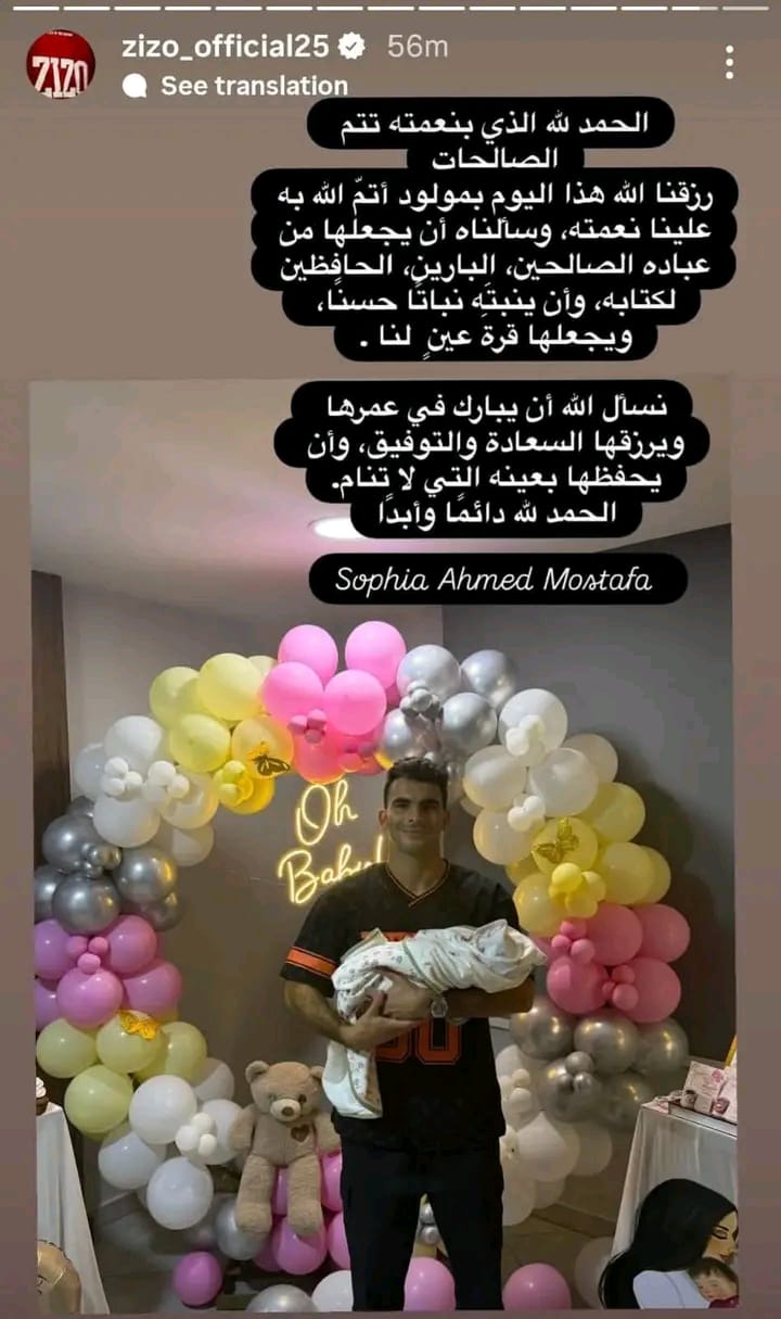 أعلن اللاعب أحمد سيد زيزو نجم الأهلي ومنتخب مصر عبر مواقع التواصل الاجتماعي عن قدوم مولودتة الثانية"صوفيا".
