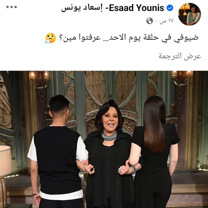 ونشرت الإعلامية إسعاد يونس عبر حسابها الشخصي"فيسبوك"، صورة لهما من الخلف مُعلقة عليها قائلا:"ضيوفي يوم الأحد..عرفتوا مين؟.