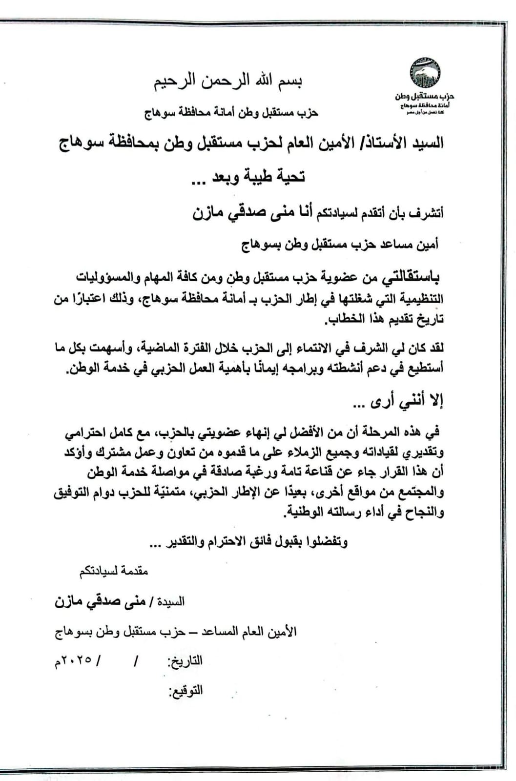 قدمت منى صدقي مازن، أمين مساعد حزب مستقبل وطن بأمانة محافظة سوهاج، استقالتها رسميًا من عضوية الحزب ومن جميع المهام التنظيمية التي كانت تشغلها، وذلك بتاريخ اليوم 15 أكتوبر 2025، على خلفية عدم تمثيلها في القائمة الوطنية الخاصة بمحافظة سوهاج.