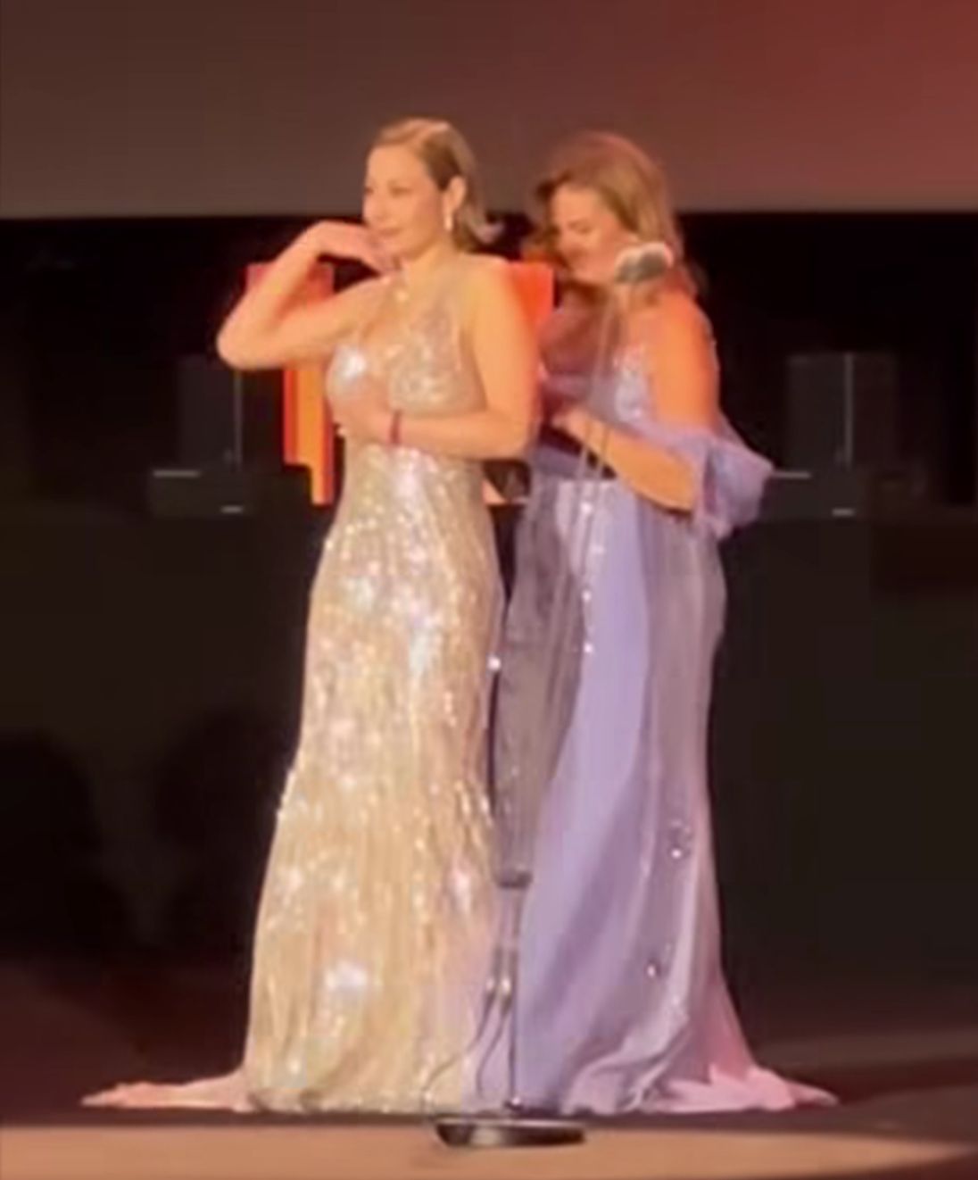 صعدت الفنانة منة شلبي لتكريمها على المسرح وأثناء احتضانها للفنانة يسرا، تسبب في فك سوستة الفستان، لكن يسرا أنقذت الموقف سريعا.
