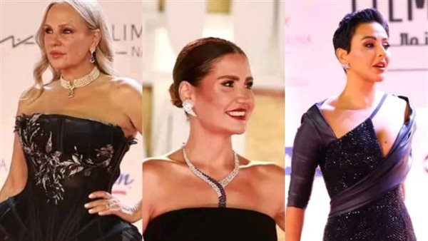 فيما ظهرت الفنانة إلهام شاهين أيضا فستان أسود مدهب و مجسم ومحتشم بسيط.