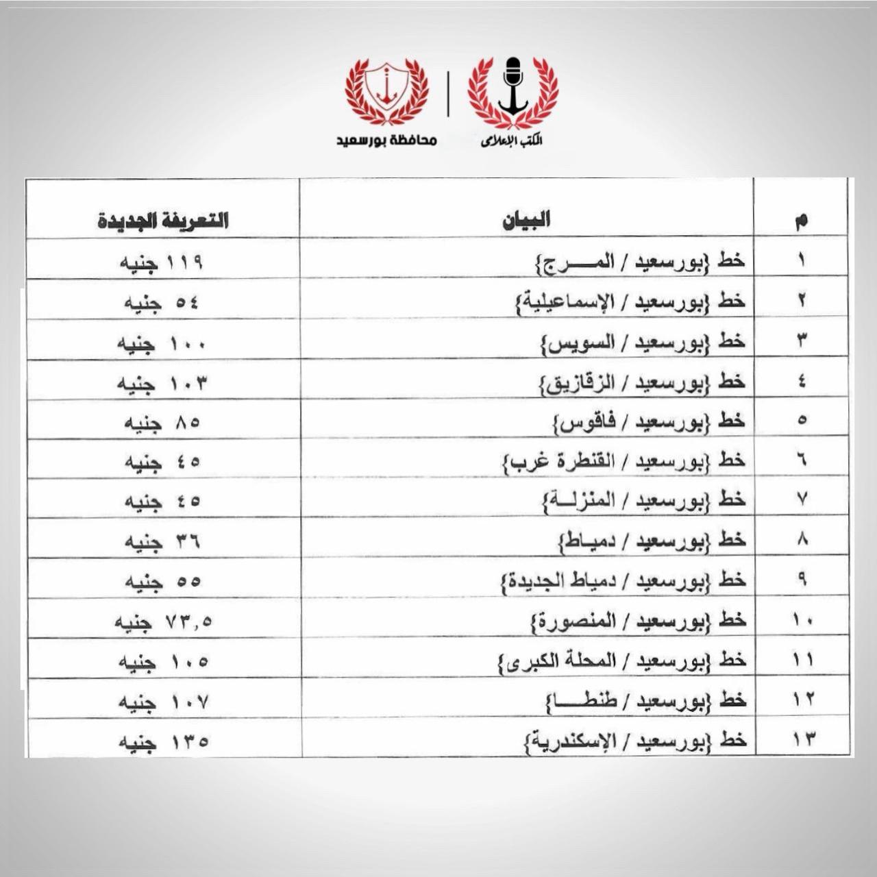 وبالنسبة لتعريفة الركوب بميناء بورسعيد البري بين المحافظات، جاءت كما يلي : خط بورسعيد المرج 119 جنيها ، وبورسعيد الإسماعيلية 54 جنيها ، وبورسعيد السويس 100 جنيها ، بورسعيد الزقازيق 103 جنيها ، وبورسعيد فاقوس 85 جنيها ، وبورسعيد القنطرة غرب 45 جنيها ، وبورسعيد المنزلة 45 جنيها ، وبورسعيد دمياط 36 جنيها ، بورسعيد دمياط الجديدة 55جنيهٱ