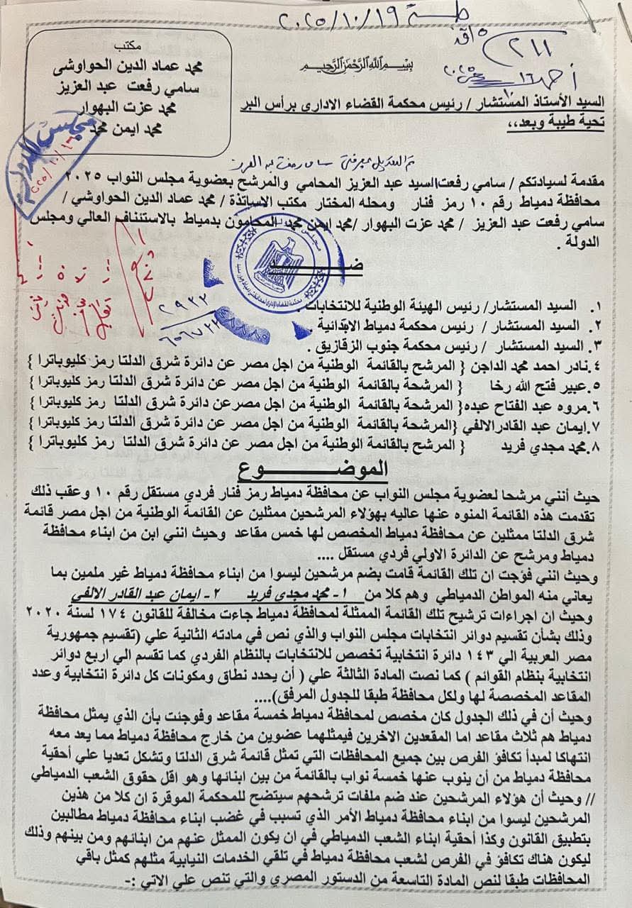 وطالب في الشكوى المحكمة باتخاذ الإجراءات القانونية لمنع ضم المرشحين من خارج المحافظة، بما يضمن تمثيل دمياط بشكل كامل وفقًا للقانون والدستور المصري.