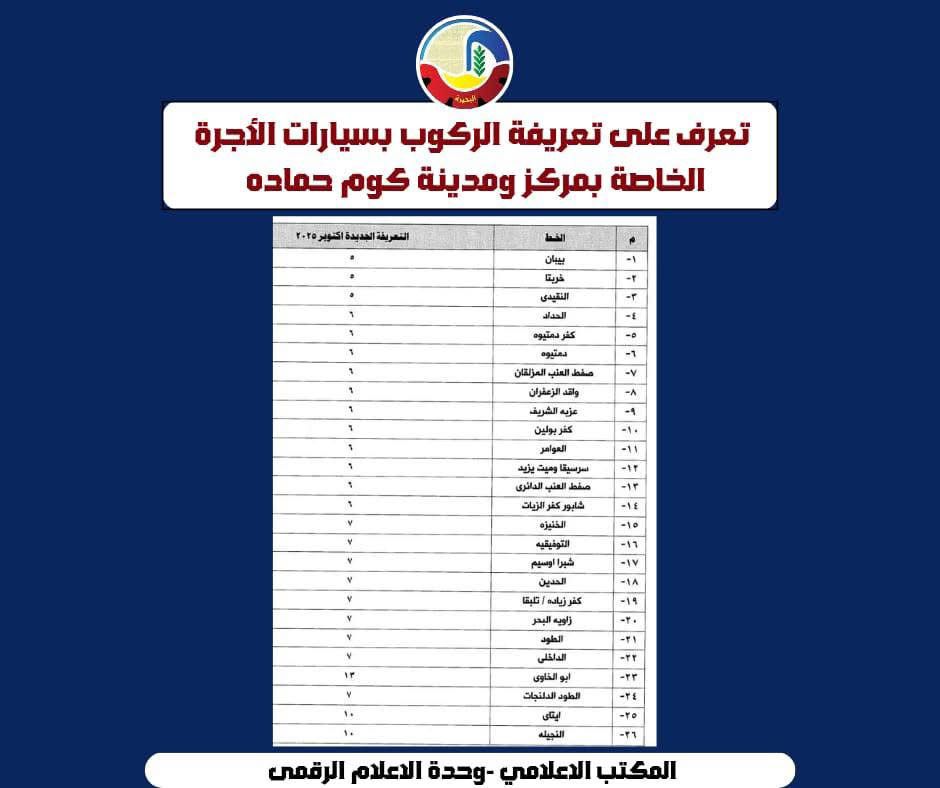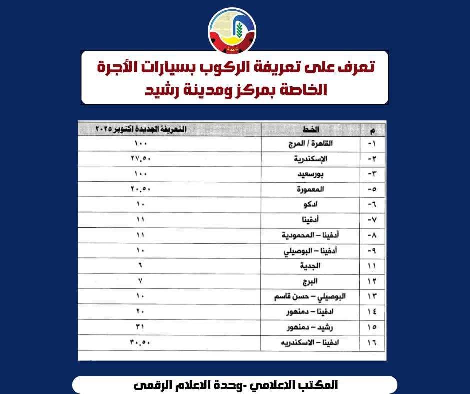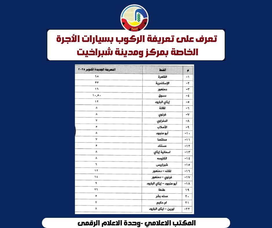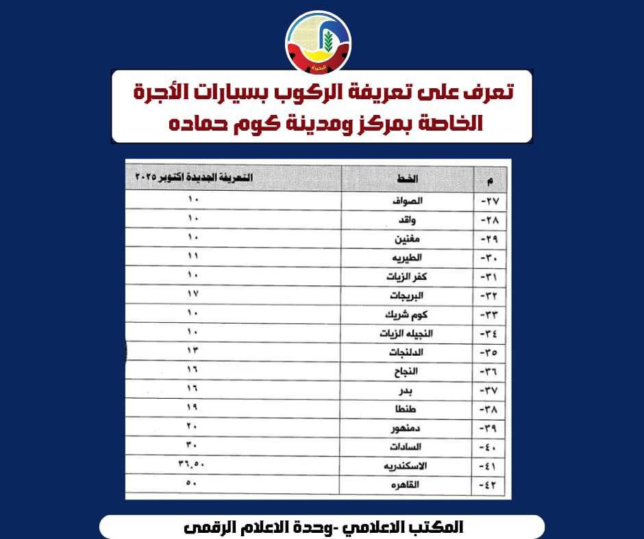 ٱعتمدت الدكتورة جاكلين عازر – محافظ البحيرة، التعريفة الجديدة لركوب سيارات الأجرة والسرفيس والنقل العام والتاكسي والتوك توك، وذلك عقب قرار لجنة تسعير المنتجات البترولية بزيادة أسعار المواد البترولية صباح اليوم.