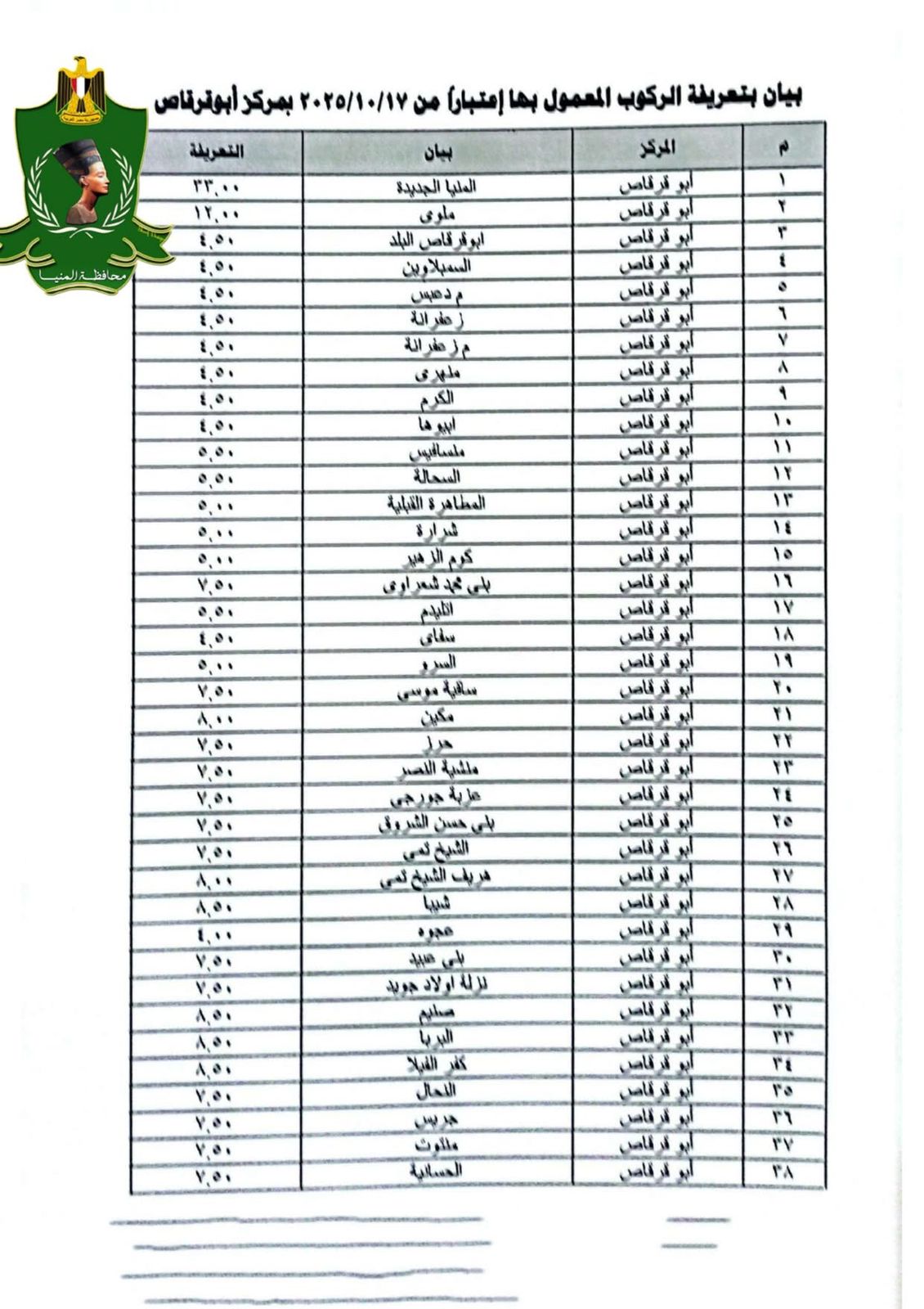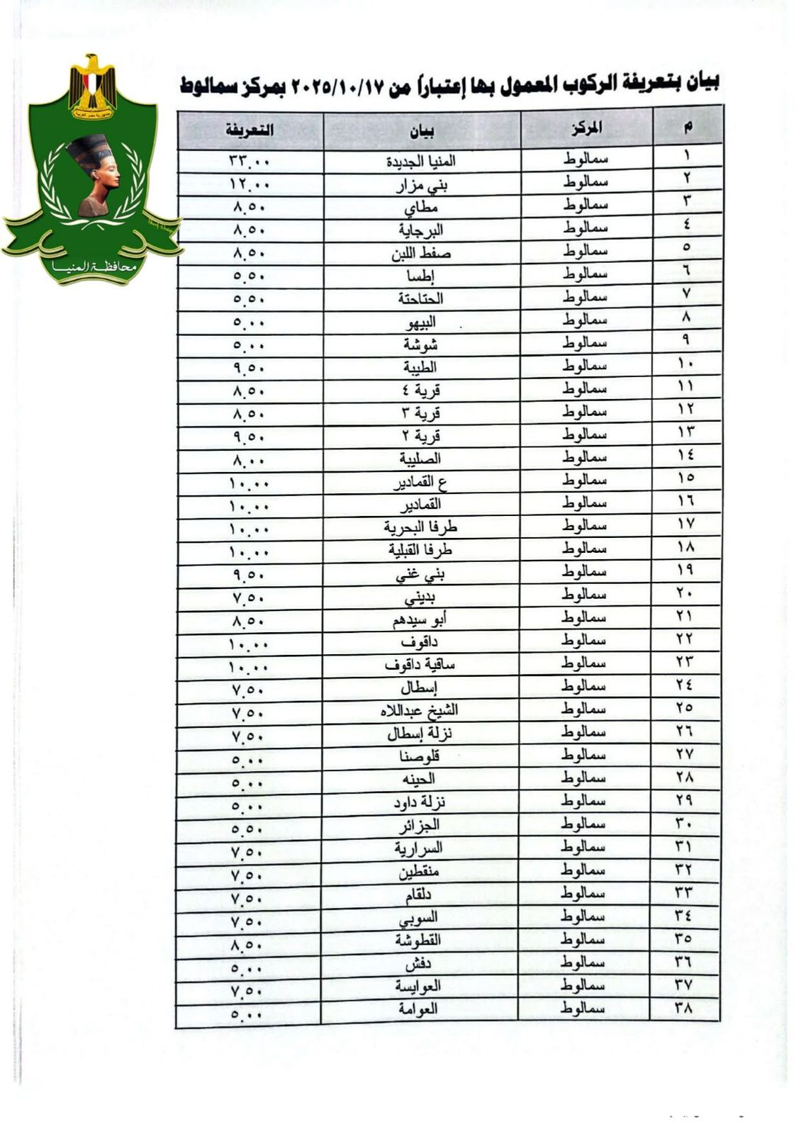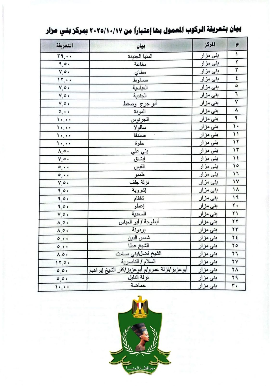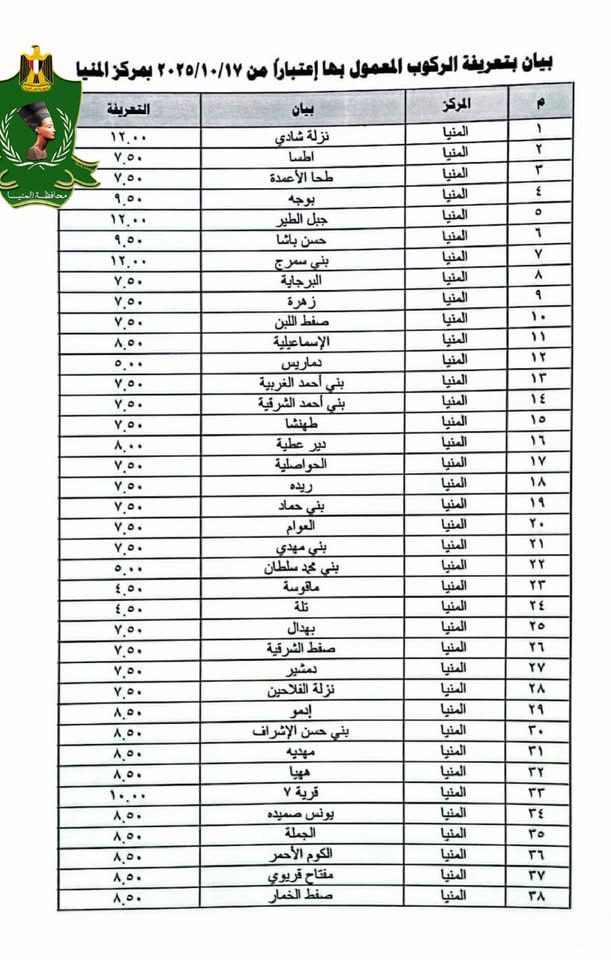 الأسعار الرسمية لتعريفة الركوب الجديدة بمحافظة المنيا بعد تحريك أسعار الوقود