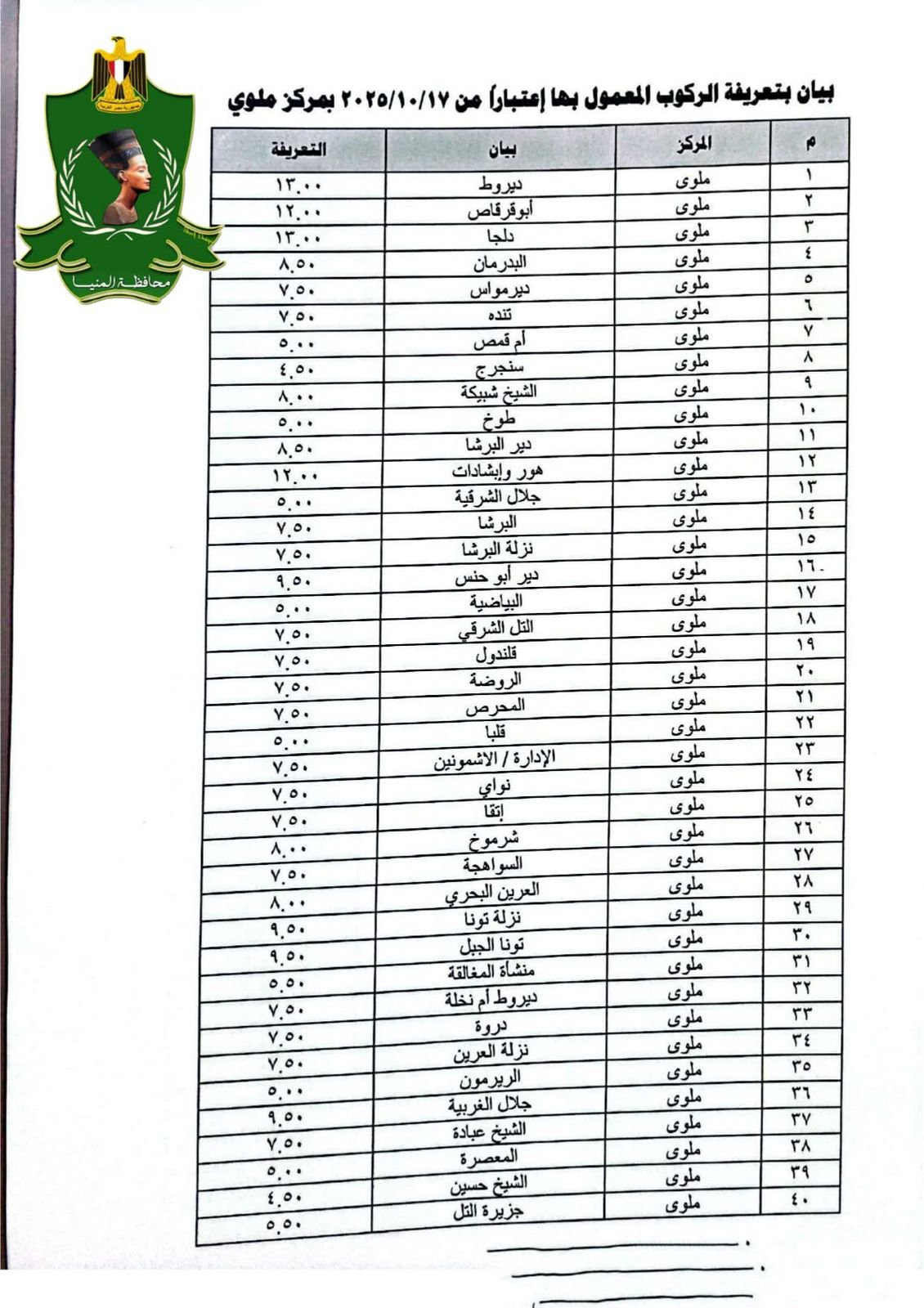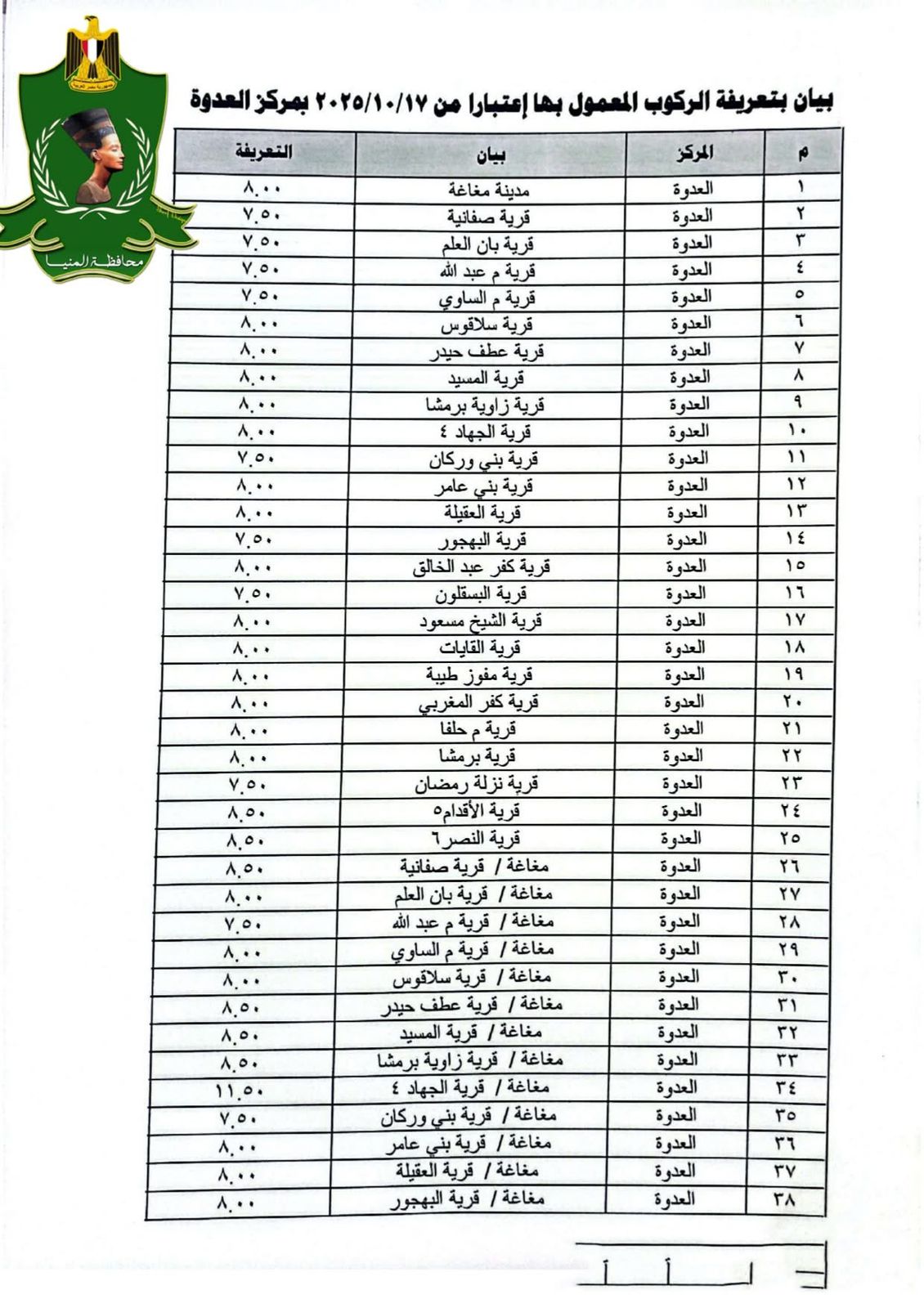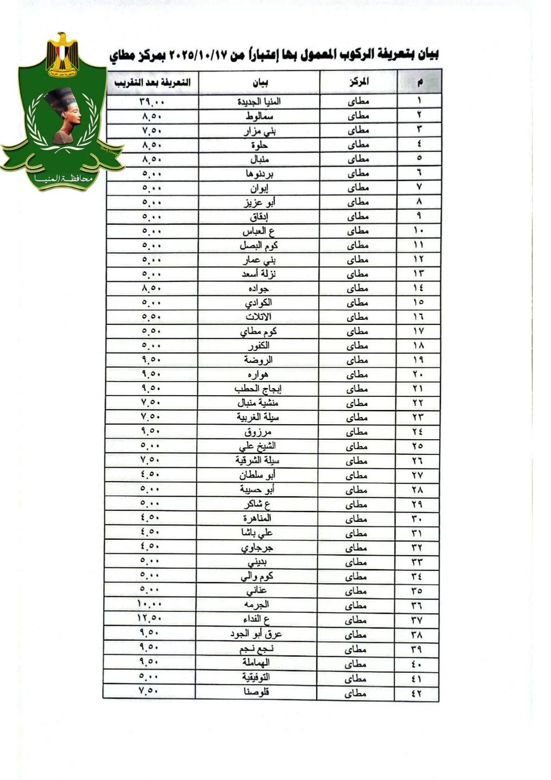 الأسعار الرسمية لتعريفة الركوب الجديدة بمحافظة المنيا بعد تحريك أسعار الوقود