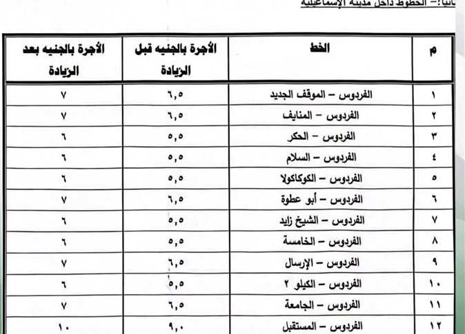 جاءت تعريفة المواصلات الجديدة في مواقف السيارات بالإسماعيلية كالتالي