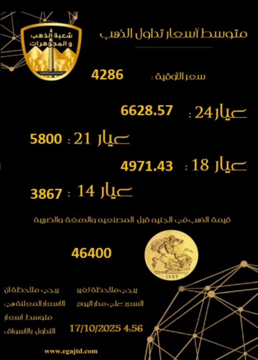وفي ختام تعاملات اليوم الجمعة 17 أكتوبر 2025، وصل سعر الجنيه الذهب إلى 46400 جنيهًا للبيع، فيما بلغت سعر الأوقية نحو 4286 دولارًا تقريبًا، متأثرة بتحركات أسعار الذهب في البورصات العالمية التي شهدت ارتفاعًا ملحوظًا خلال الساعات الأخيرة.