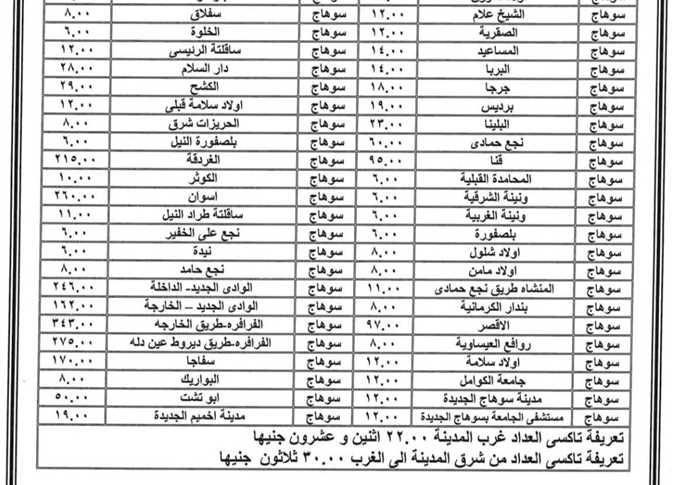 وفي سوهاج، أصدر المحافظ قرارًا بزيادة تعريفة سيارات الأجرة بنسبة 15% لكلا السيارات العاملة بالسولار والبنزين، مع إلزام السائقين بالإعلان عن التعريفة الجديدة داخل السيارات والمواقف، وتشديد الرقابة لضبط المخالفين.