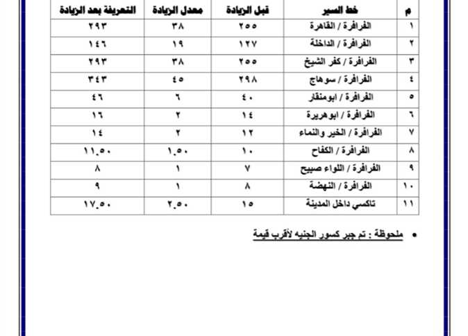 | خط السير | التعريفة الجديدة (جنيه) | التعريفة القديمة (جنيه) |