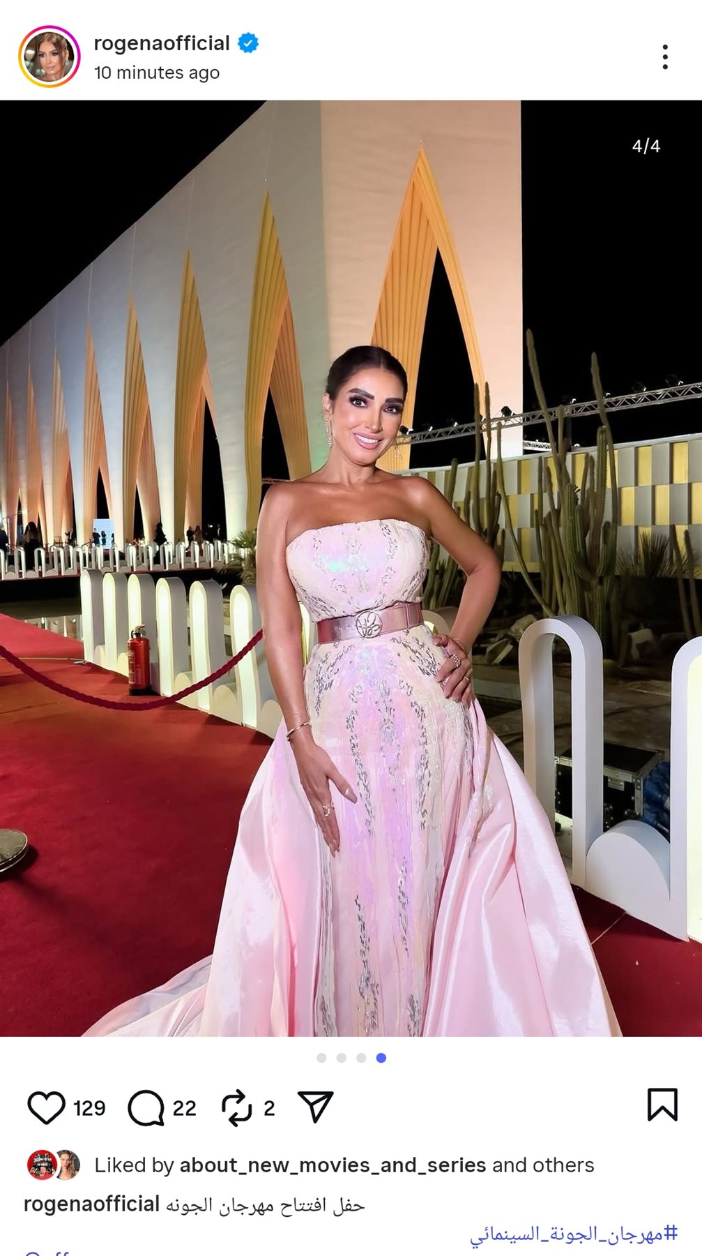 وشاركت روجينا جمهورها صور حفل افتتاح مهرجان الجونة، من خلال حسابها الرسمي عبر موقع تبادل الصور والفيديوهات القصيرة إنستجرام، وكتبت: حفل افتتاح مهرجان الجونة السينمائي.