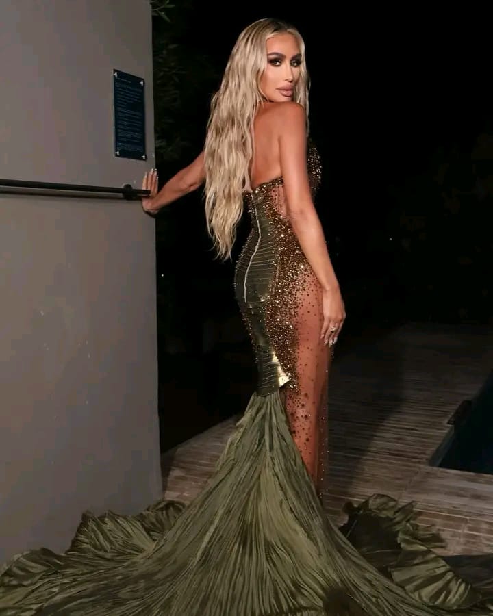 وظهرت مرة أخرى بفستان طويل باللون الأخضر مكشوف من منطقه الصدر، وبه فاتحه من الساق، كما تميز بتفاصيل أنيقة أضفت لمسة من الفخامة على إطلالتها، واعتمدت تسريحة شعر منسدل على كتفيها، مع مكياج ناعم أبرز جمال ملامحها وجعل إطلالتها أكثر رقيًا وجاذبية.