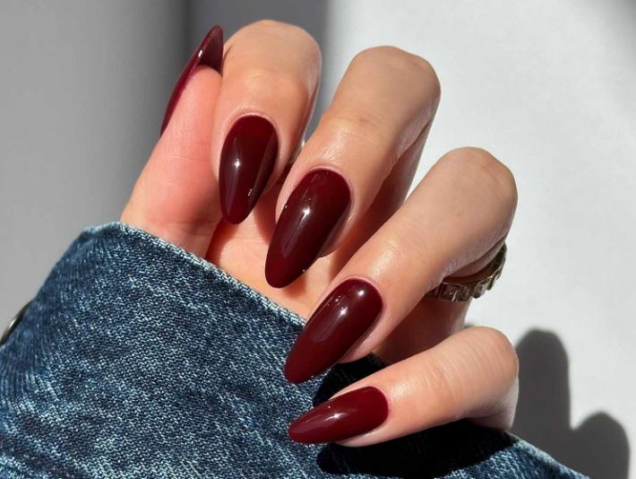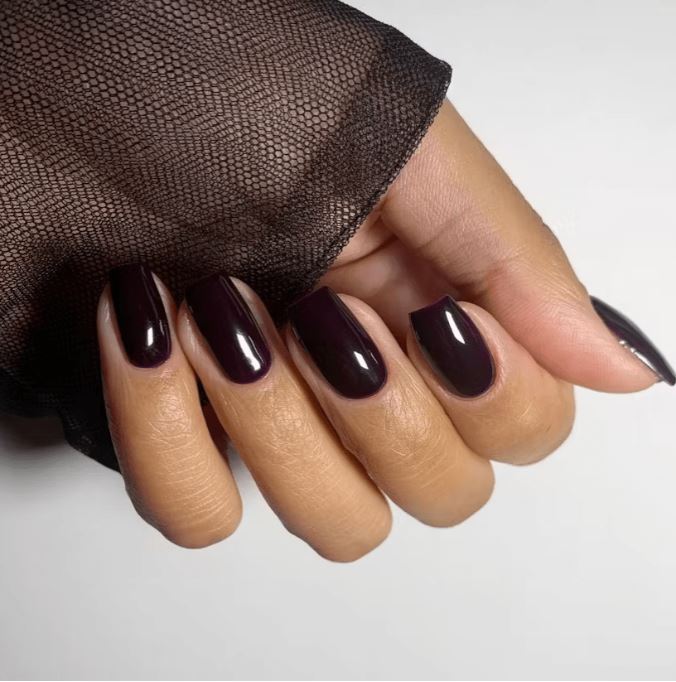 يعد اللون الأحمر الداكن جدًا، القريب من الأسود، من الألوان الخريفية الأساسية. يمنح الأظافر لمسة فاخرة وغامضة في نفس الوقت.