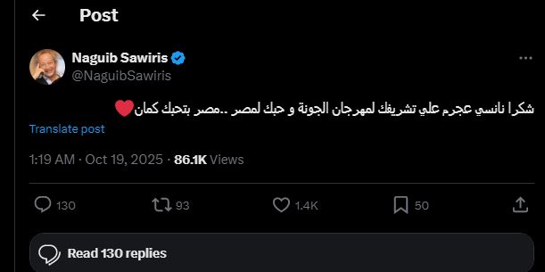وكتب ساويرس في تغريدة له عبر حسابه الرسمي "إكس" تويتر سابقآ" شكرا نانسي عجرم علي تشريفك لمهرجان الجونة وحبك لمصر .. مصر بتحبك كمان".