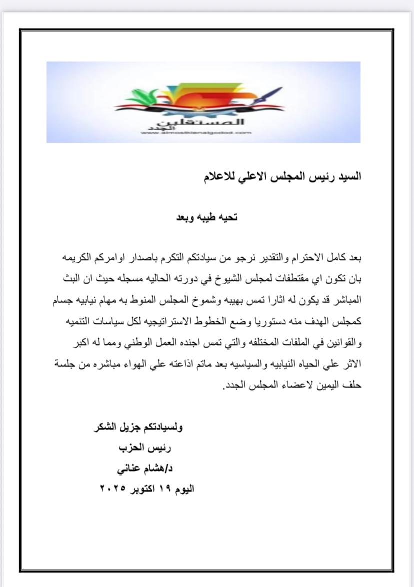 طالب حزب المستقلين الجدد الهيئة الوطنية للإعلام بعدم بث جلسات مجلس الشيوخ مباشرة على الهواء، واقتصار التغطية الإعلامية على مقتطفات مسجلة يتم مراجعتها قبل إذاعتها عبر القنوات الرسمية.