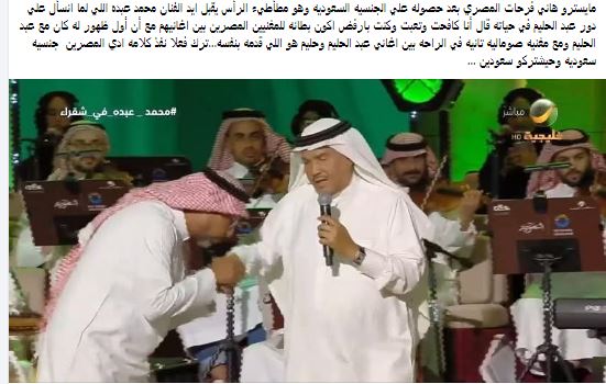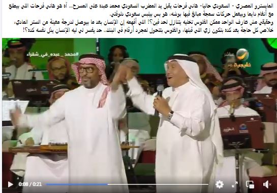 تصدر المايسترو هاني فرحات خلال الساعات الماضية تريند مواقع التواصل الاجتماعي بعدما تداول رواد السوشيال ميديا فيديو له ظهر فيها مرتديا الزي السعودي و يقبّل يد الفنان الكبير محمد عبده ، مما أثار موجة من الغضب والانتقادات واعتبره البعض أن اللقطة تصرفًا مبالغًا فيه وغير لائقة .