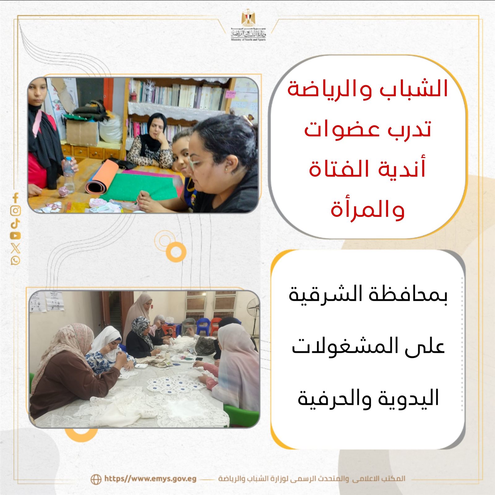 اطلقت وزارة الشباب والرياضة تدرب لعضوات أندية الفتاة والمرأة بمحافظة الشرقية للمشغولات اليدوية