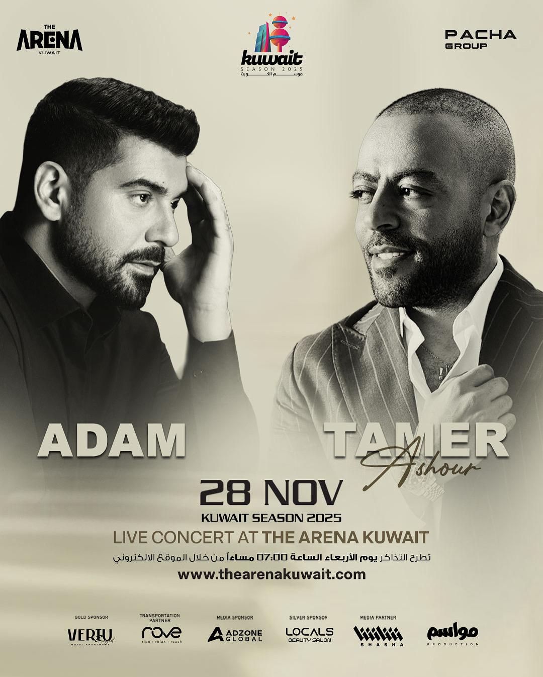 حفل استثنائي يجمع تامر عاشور وآدم بالكويت 28 نوفمبر في الارينا|تفاصيل
