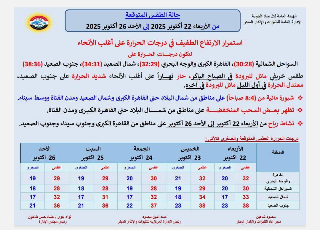 وفيما يلي بيان بدرجات الحرارة العظمى والصغرى المتوقعة خلال الفترة من الأربعاء 22 أكتوبر حتى الأحد 26 أكتوبر: