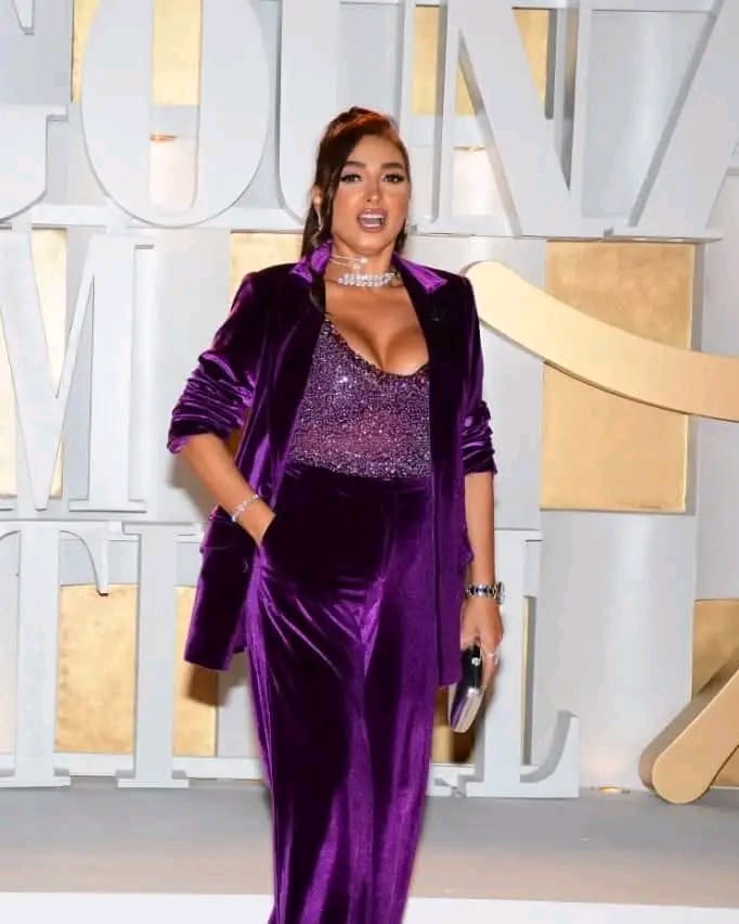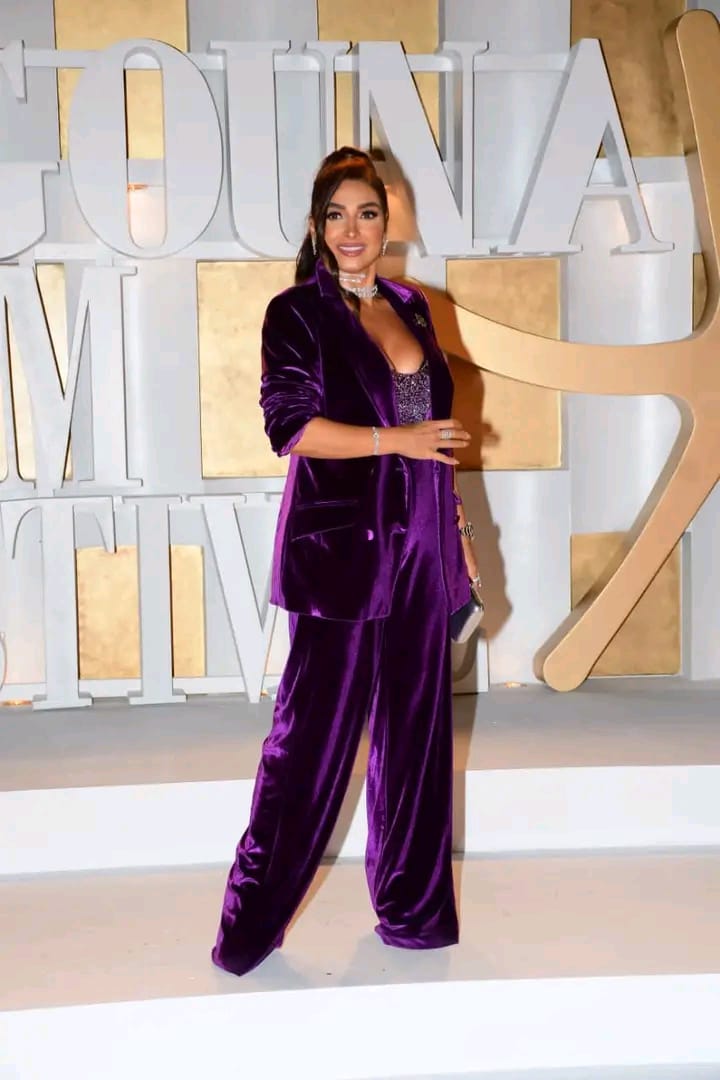 وارتدت بدلة قطيفة باللون الموف مع توب مكشوف من منطقة الصدر مما أبرز جمالها وأنوثتها، وأضاف لمسة من الجرائة مع لوك ميكب وشعر يتناسب مع الإطلالة.