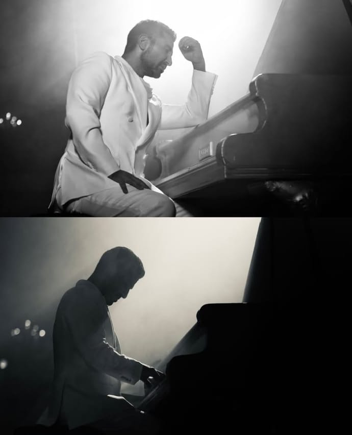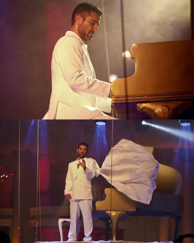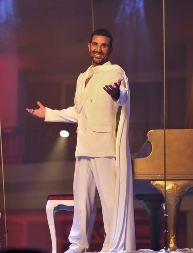 وظهر أحمد وهو يرتدي بدلة باللون الأبيض، بتصميم مختلف، وبها شال أبيض، يتدلى من الخلف، وكان يعزف على البيانو.