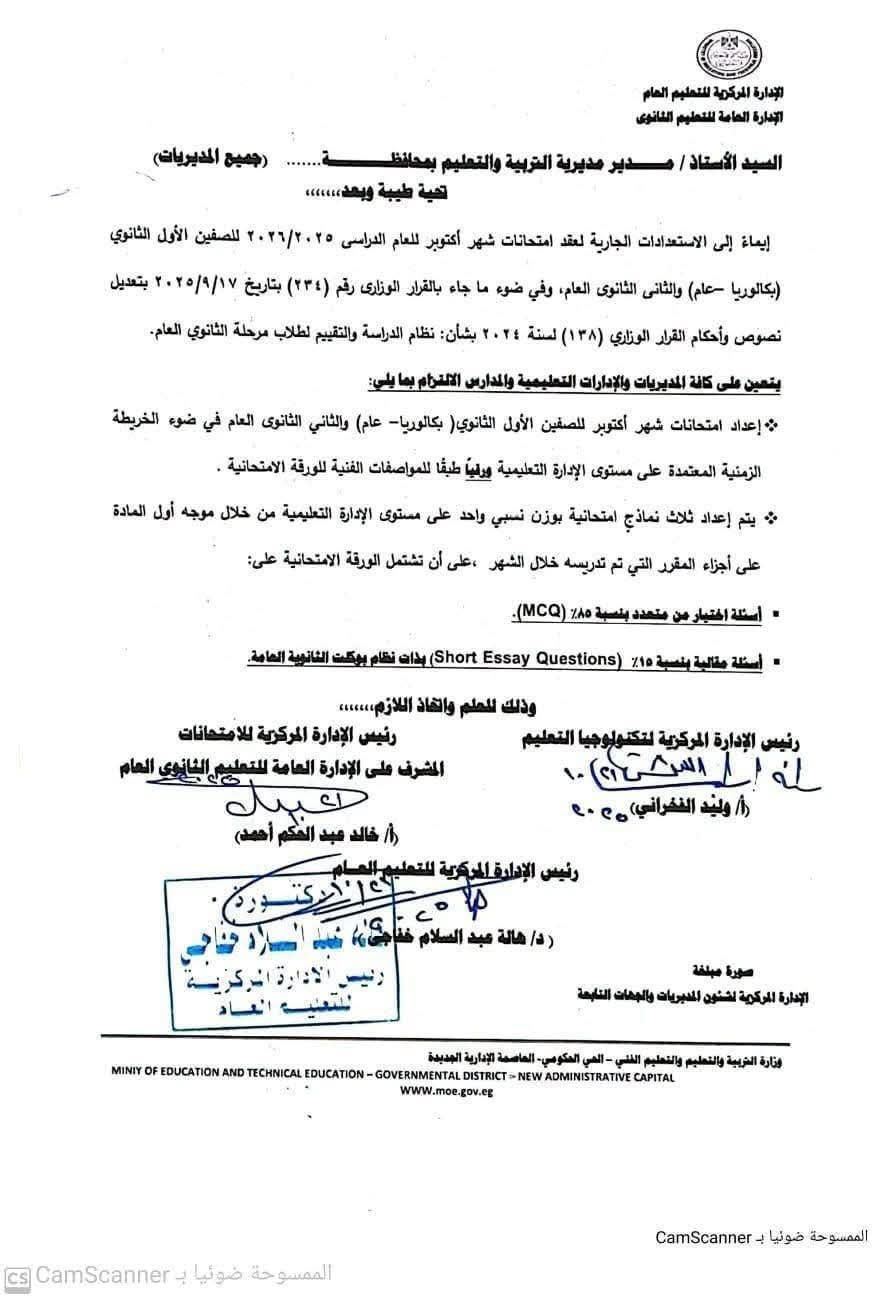 ضوابط ومواعيد اختبارات شهر أكتوبر 2025 للصفين الأول والثاني الثانوي (مستند)