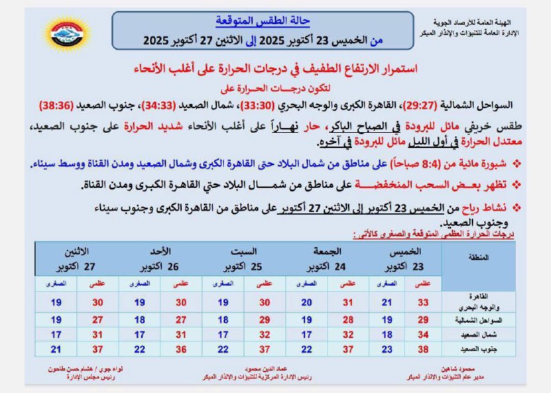 تشير التوقعات إلى استمرار الارتفاع التدريجي في درجات الحرارة خلال الفترة من الخميس 23 أكتوبر وحتى الاثنين 27 أكتوبر، وتكون درجات الحرارة العظمى والصغرى على النحو التالي: