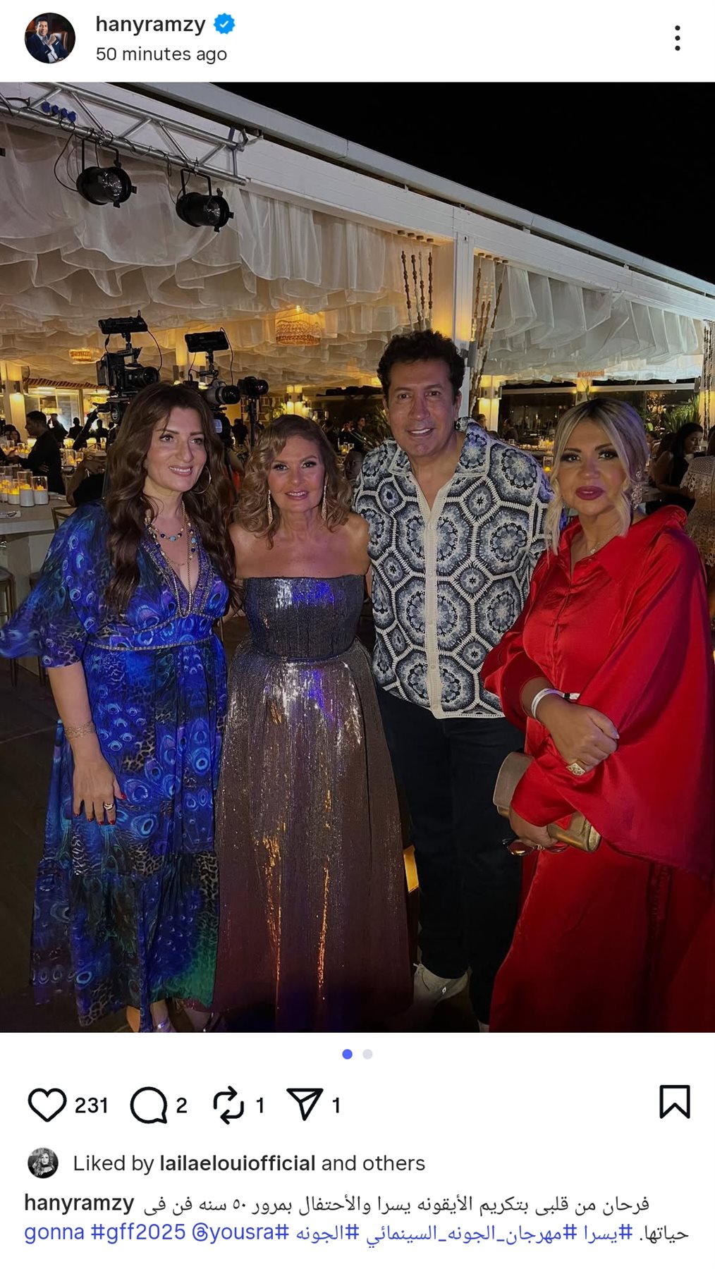 وكتب هاني رمزي: فرحان من قلبي بتكريم الأيقونه يسرا والاحتفال بمرور ٥٠ سنه فن في حياتها.