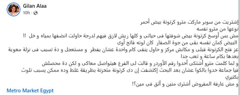 وقالت جيلان علاء عبر صفحتها الشخصية"فيسبوك"، إشتريت من سوبر ماركت مترو كرتونة بيض أحمر، كانت أوسخ كرتونة بيض شوفتها فى حياتى و كلها ريش لازق فيهم لدرجة حاولت انضفها بمياه و خل، البيض كمان نفسه بقى من جوة الصفار كان لونه فاتح أوى!!".