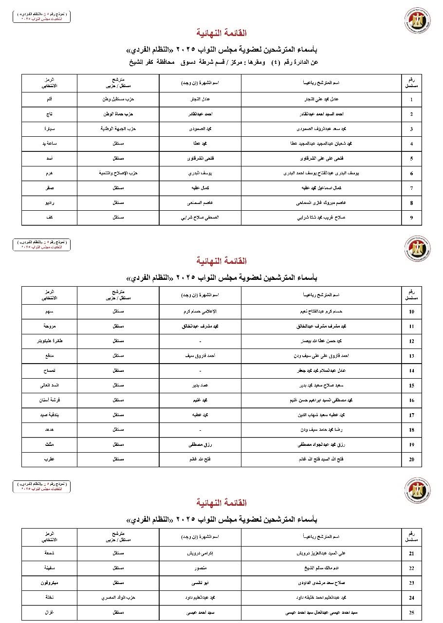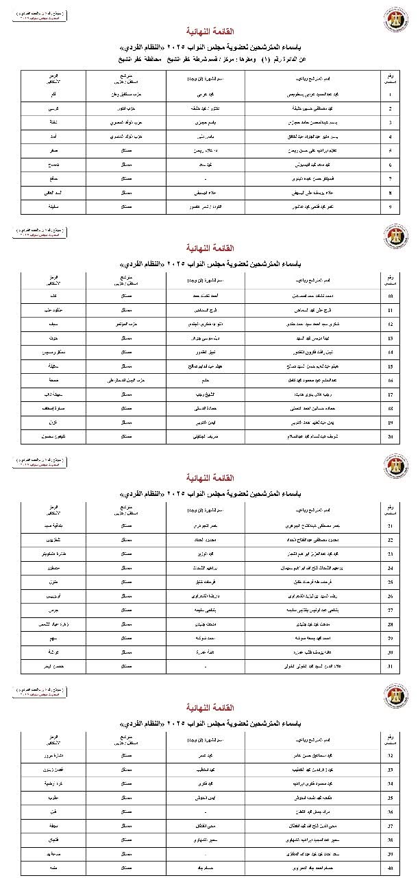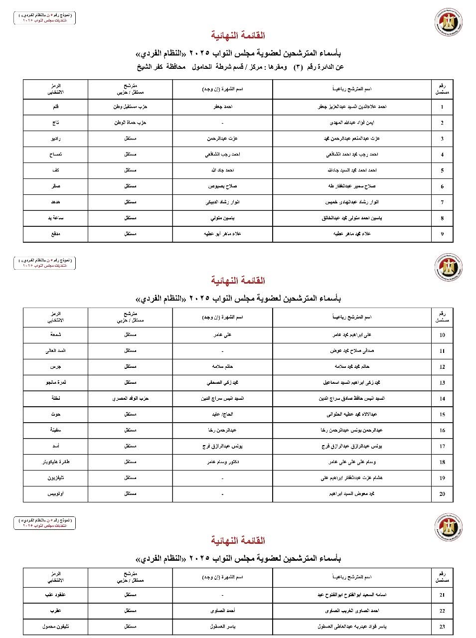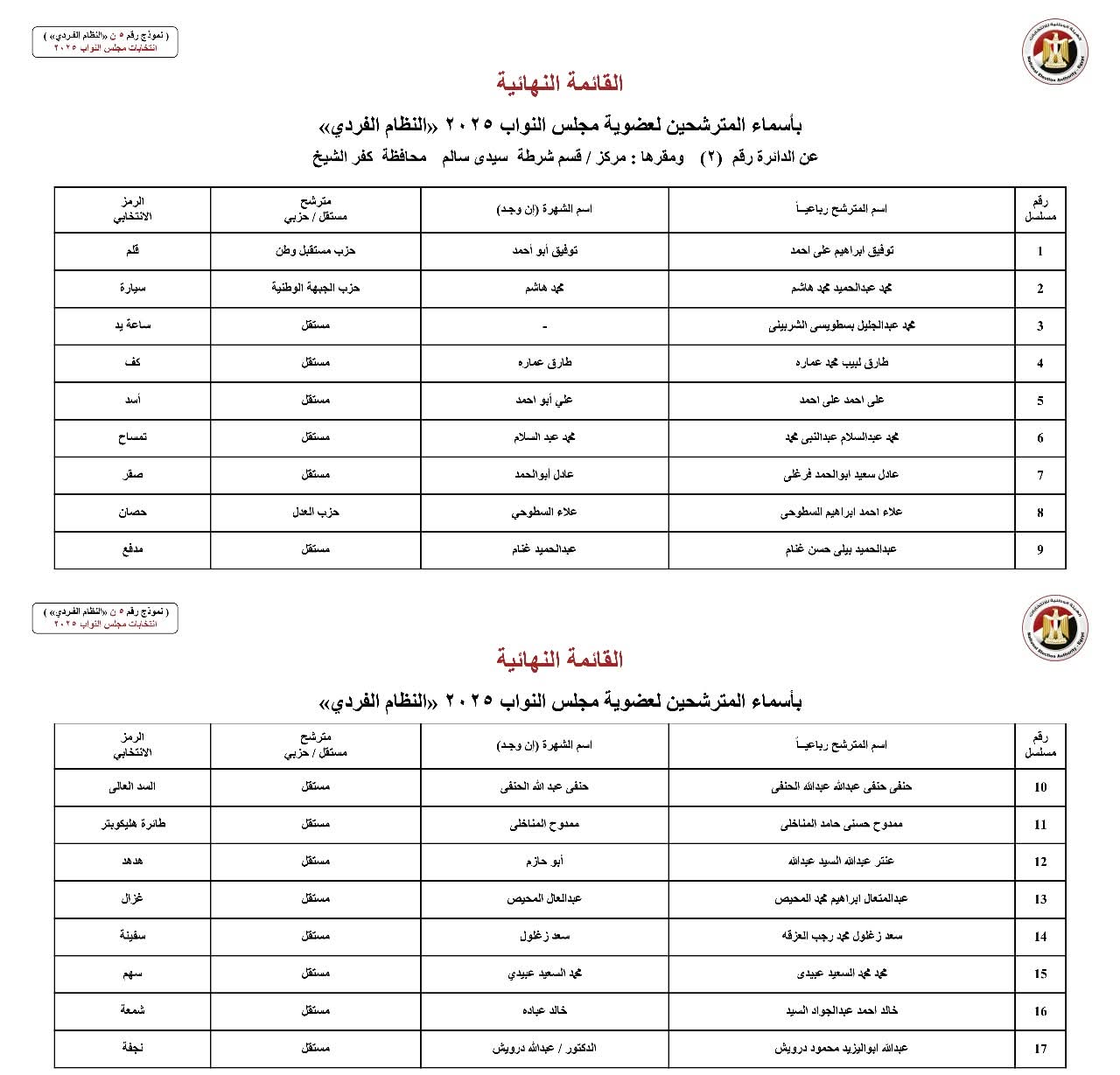 الوطنية للانتخابات تعلن رسمياً الكشوف النهائية لمرشحي الفردي بانتخابات النواب (محافظة كفر الشيخ)