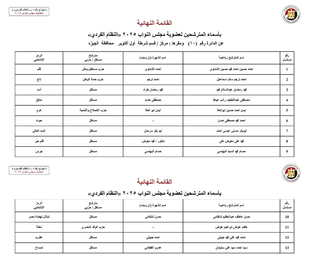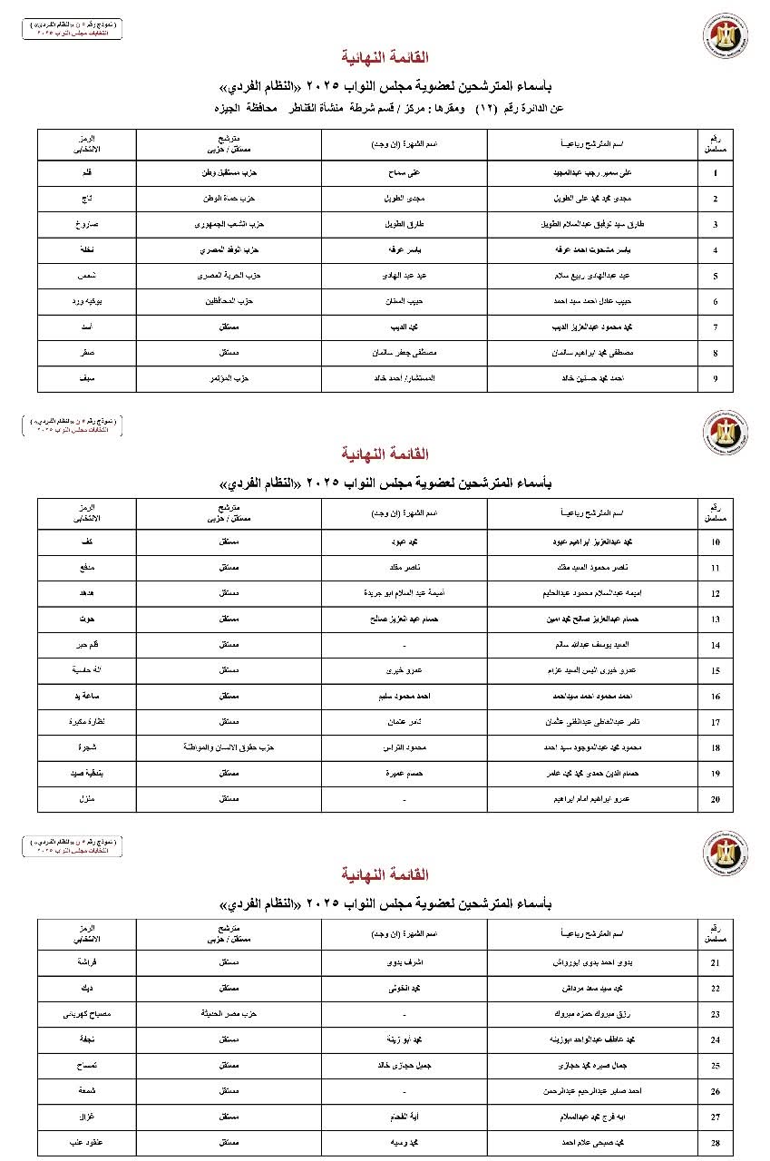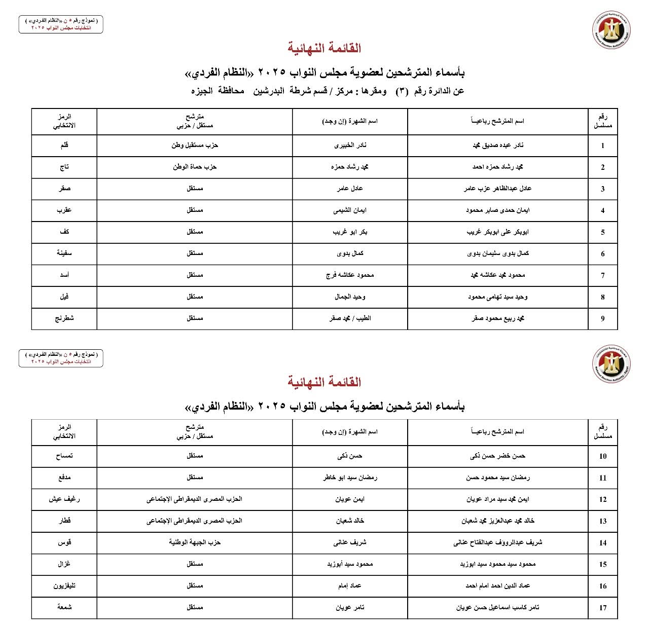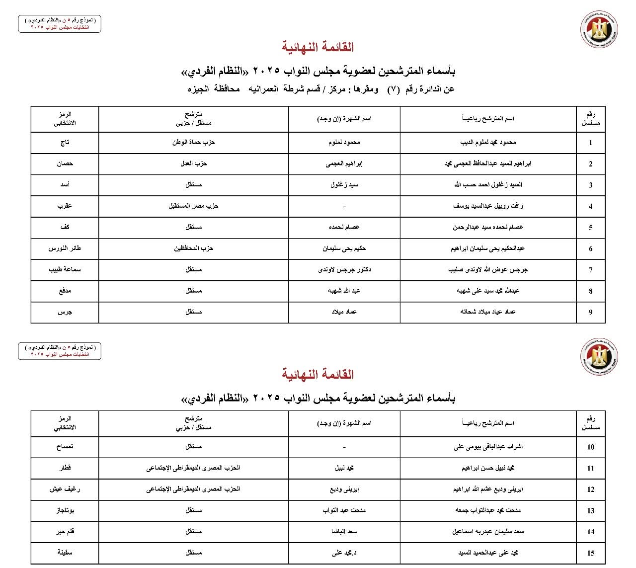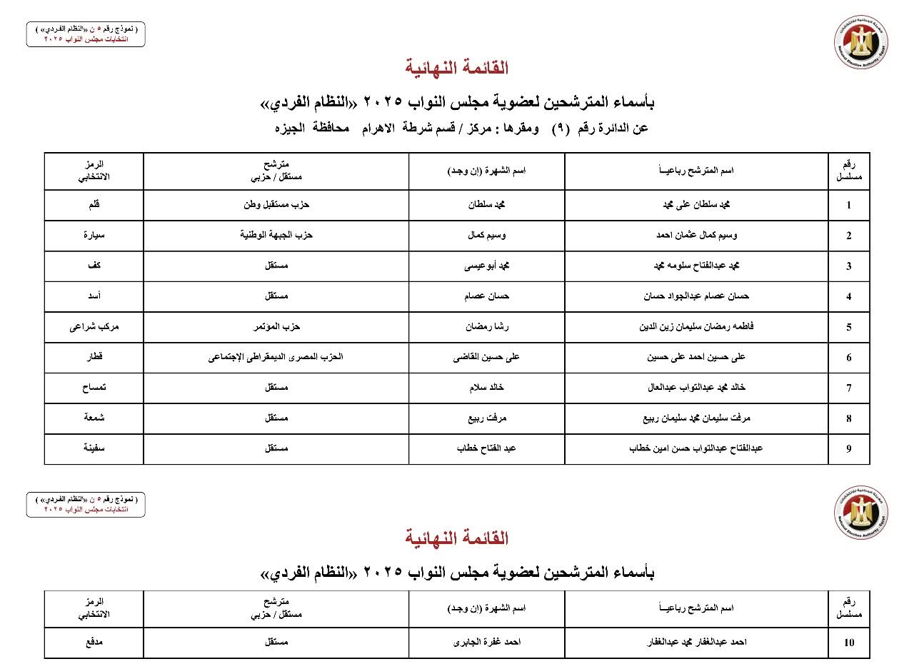 الوطنية للانتخابات تعلن رسميًا الكشوف النهائية لمرشحي الفردي بانتخابات النواب (محافظة الجيزة)