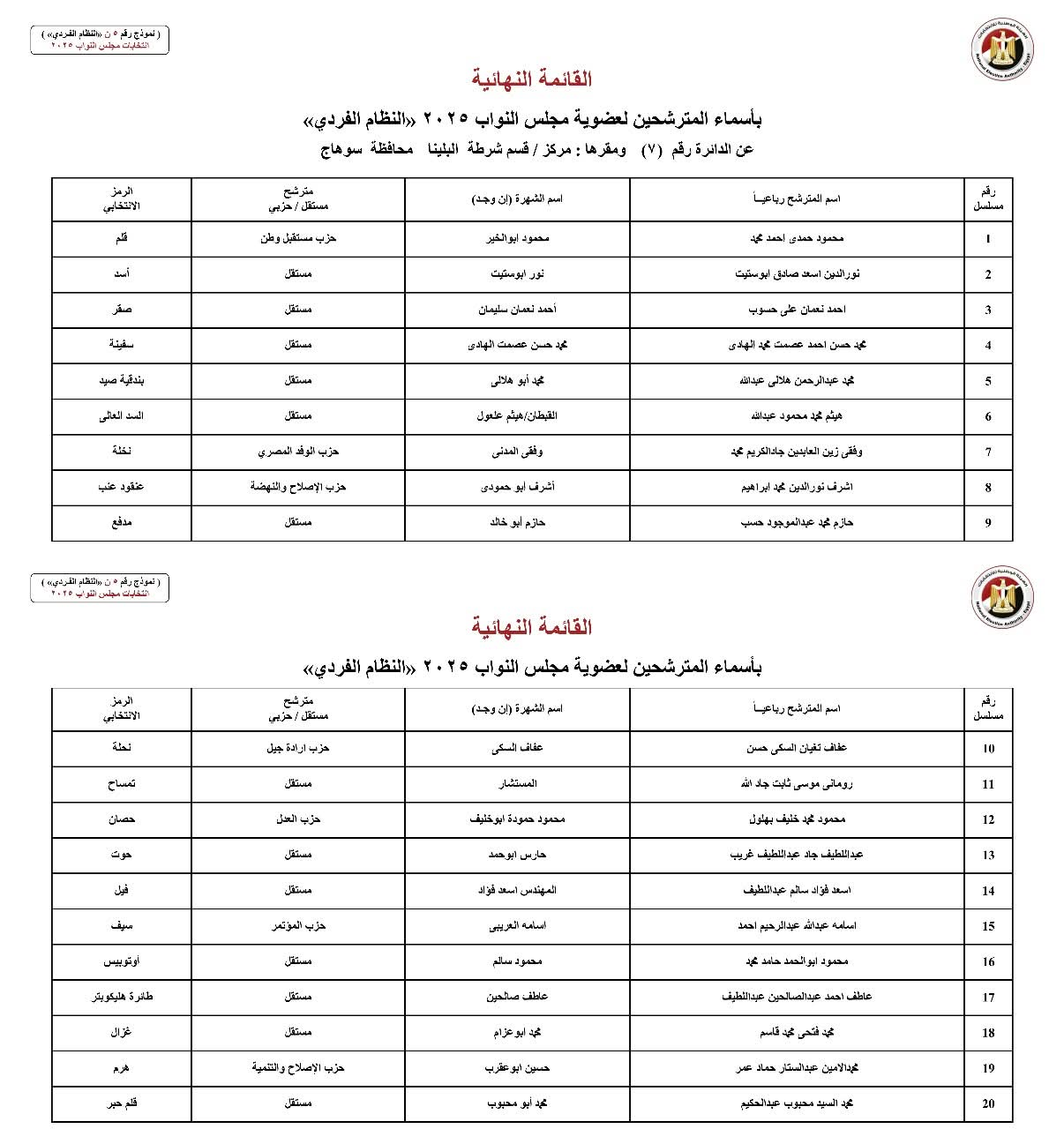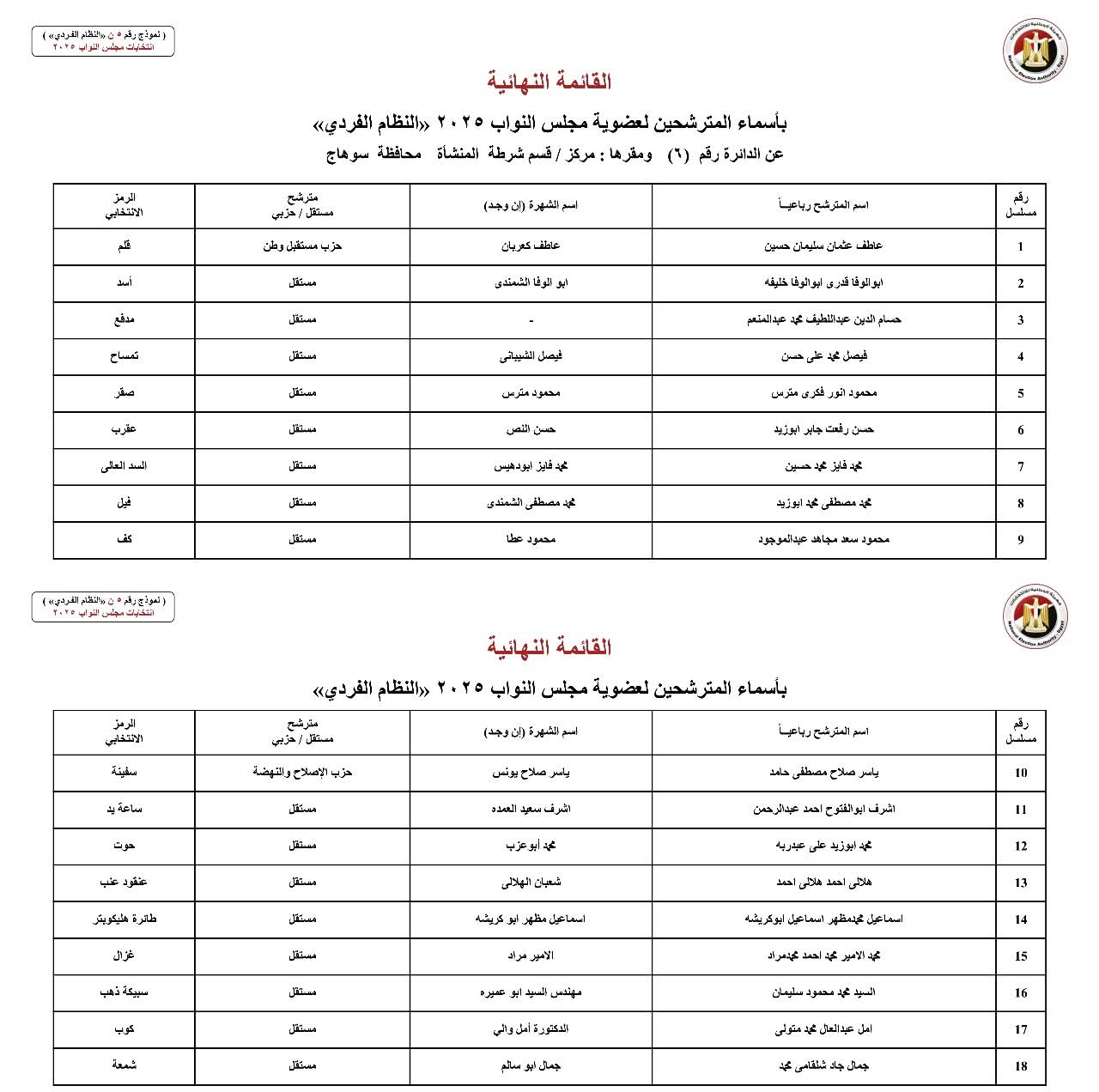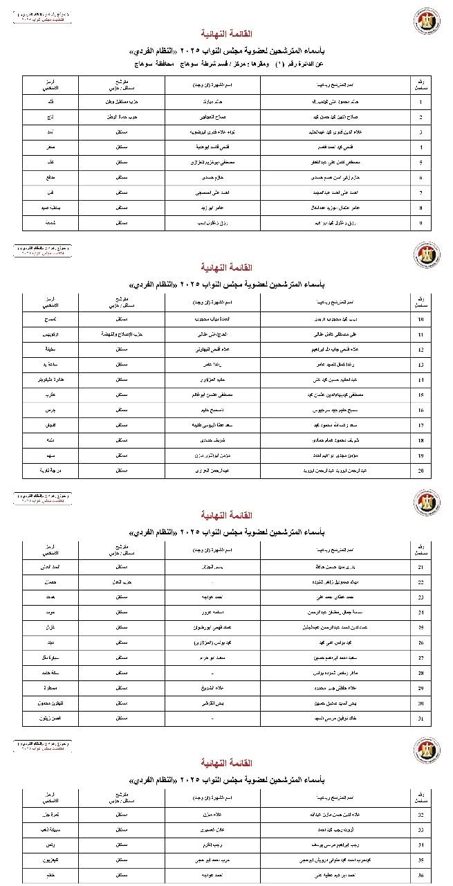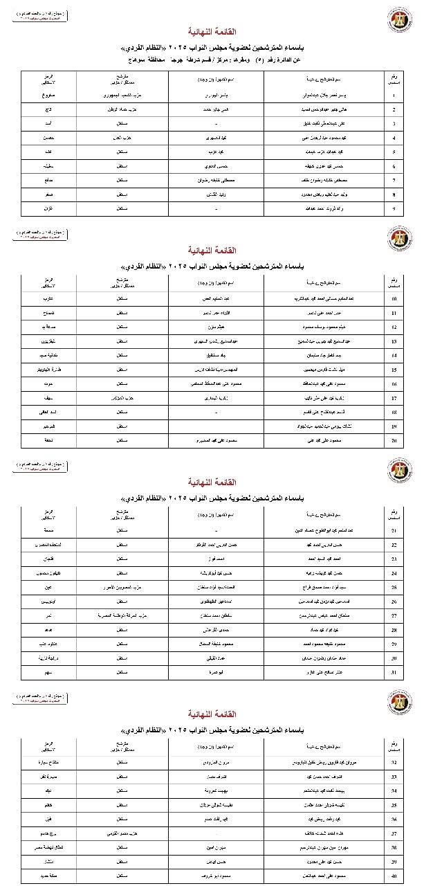 أعلنت الهيئة الوطنية للانتخابات اليوم رسميًا الكشوف النهائية للمرشحين بمحافظة سوهاج بالنظام الفردي في انتخابات مجلس النواب 2025.