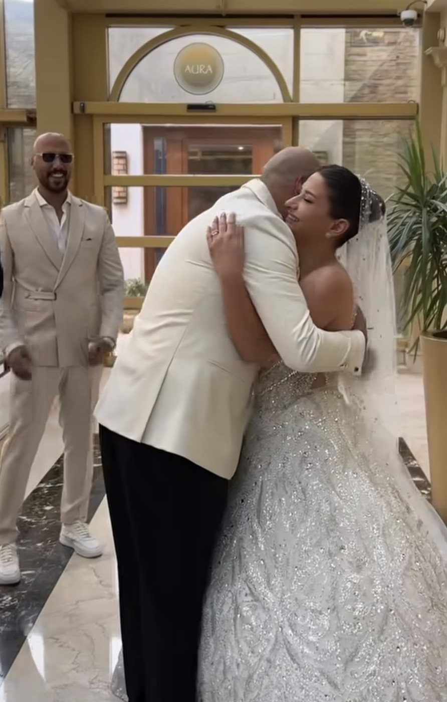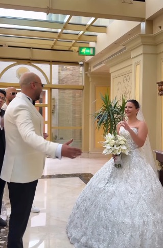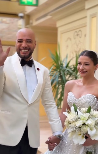 وظهرت زوجتة بإطلالة أنيقة وفستان فاخر، ونالت إطلالتها أعجاب المتابعين.