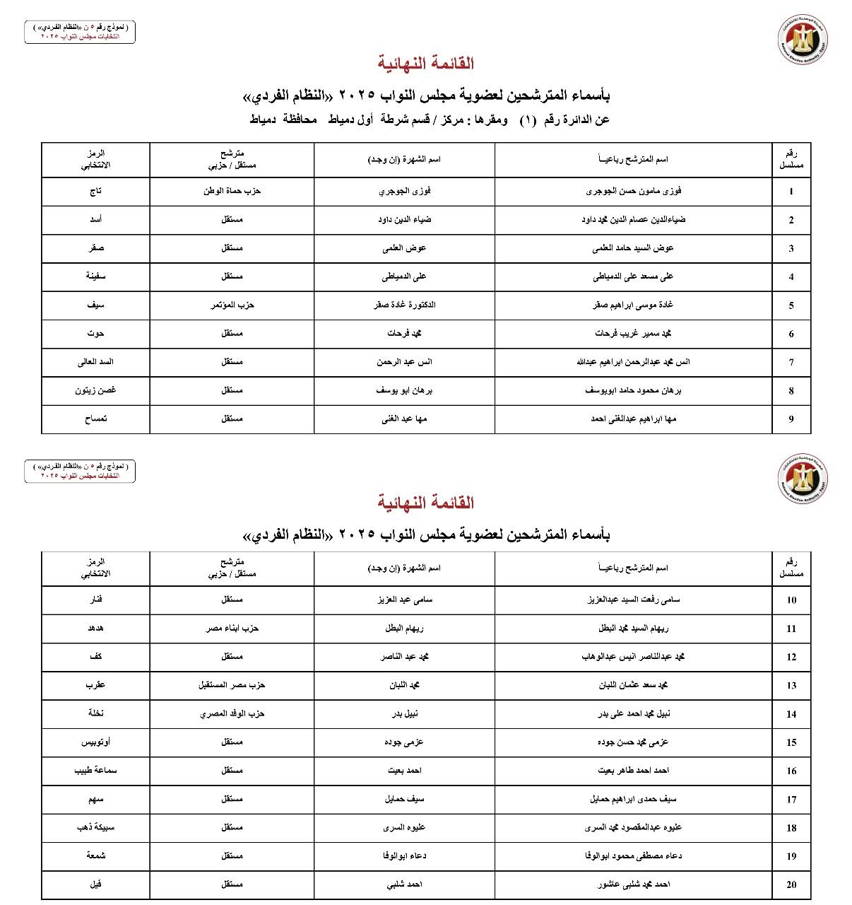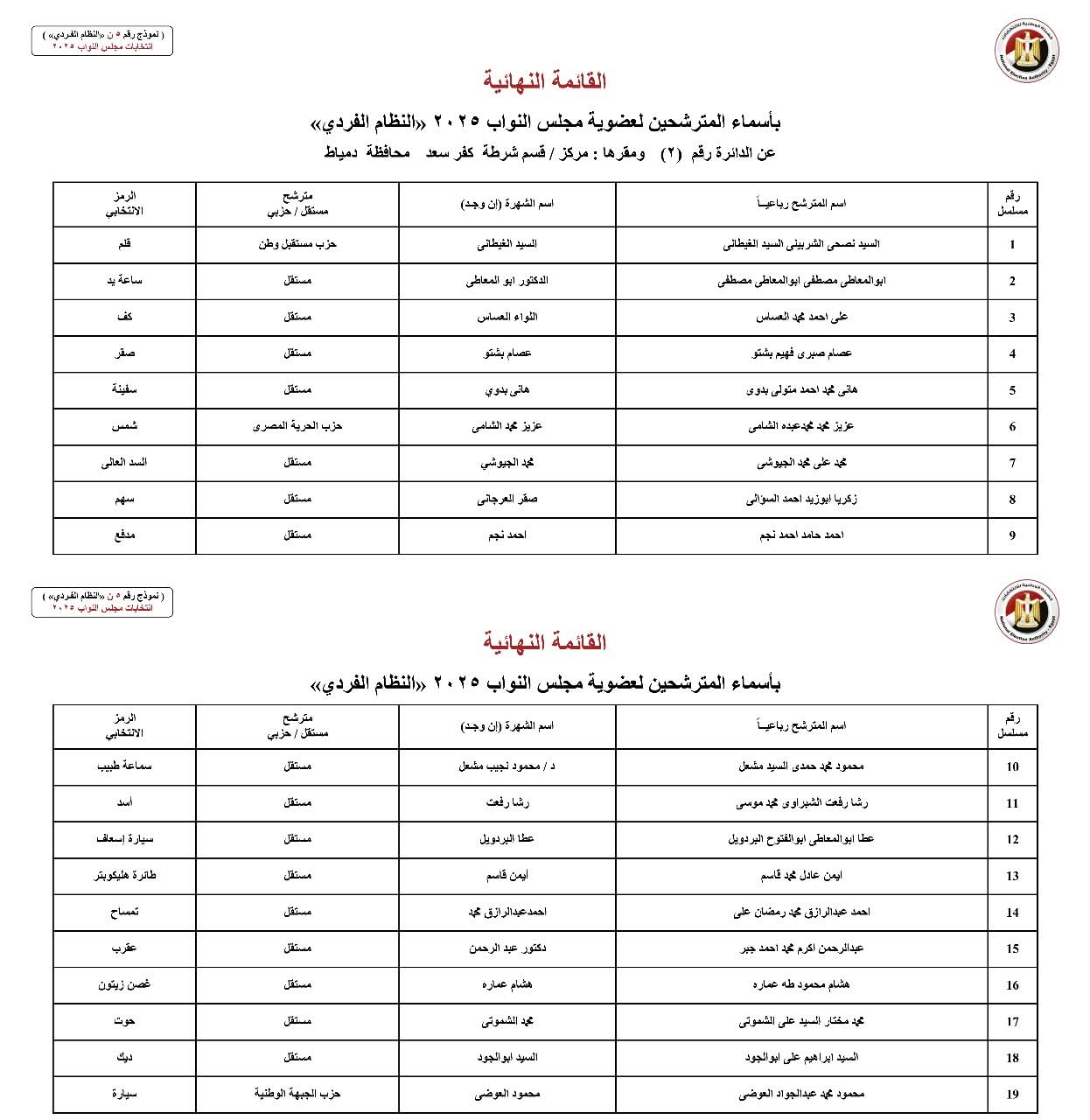 أعلنت الهيئة الوطنية للانتخابات اليوم رسميًا الكشوف النهائية للمرشحين بمحافظة دمياط بالنظام الفردي في انتخابات مجلس النواب 2025.